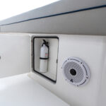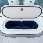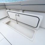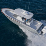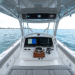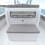The hardtop package comes with an assortment of accessories (Lumitec spreader lights, a six-rod rocket launcher and overhead electronics and radar pods) that’ll keep you battle-ready 24/7. You can also get a custom fabricated fold-down marlin tower (with removable sunshade) and fixed or telescoping outriggers from Gemlux or Rupp. Maintenance conveniences include an automatic engine flushing system and Costa Marine covers for the entire boat, or for specific areas like the console, lounge, helm seating and engines.