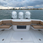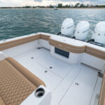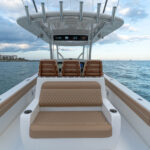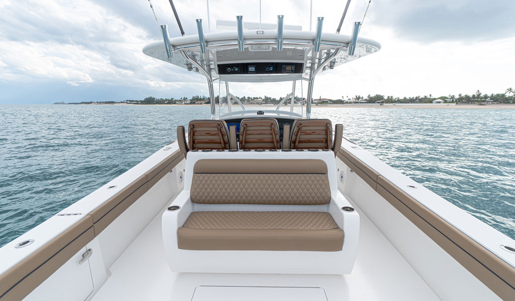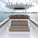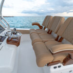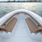 The V-37 can be outfitted with an aft mezzanine seating module with armrests, tackle storage and an insulated cooler (or optional live well) under the seat. And she’s loaded with lockers, compartments and hardware that maximize storage while maintaining the boat’s 360-degree accessibility. For instance, the standard lounge that’s integrated into the forward console holds a cooler and dry storage, and the GG Schmitt transom seats can be flipped up and out of the way when it’s time to fish.