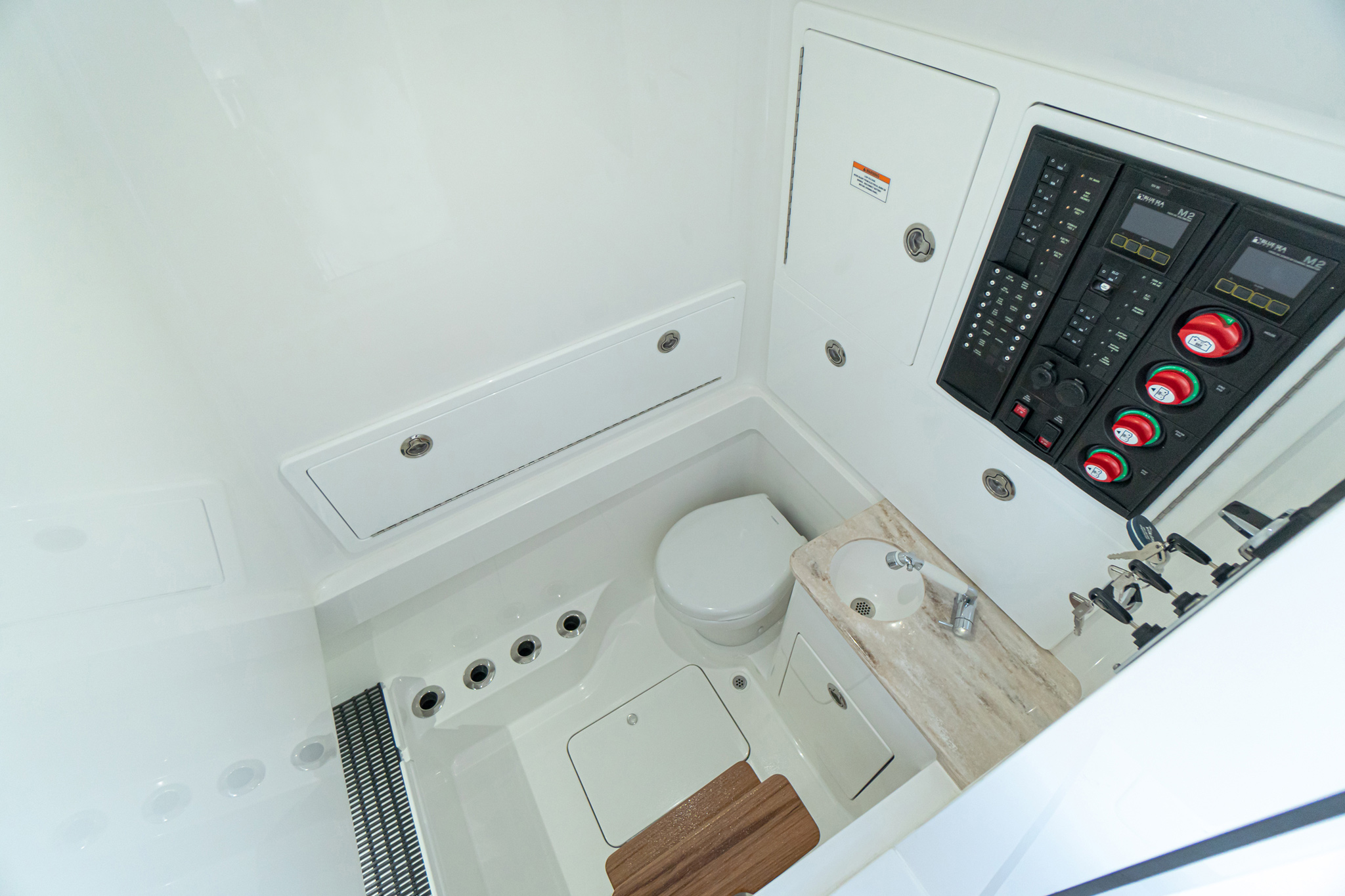 Performance needs vary depending on region, fishing preferences, targeted species and other factors. With that in mind, we offer four different power choices: triple Mercury Verado 300s or 400s, triple Yamaha 350s or twin Yamaha 450s. Ease of operation and comfort aboard are high priorities. Each engine installation can be equipped with joystick helm control featuring GPS station-keeping. The V-37 has been designed and engineered for a Seakeeper SK 3, which is mounted in the stringer grid and accessed through a gasketed, tightly sealed deck hatch.