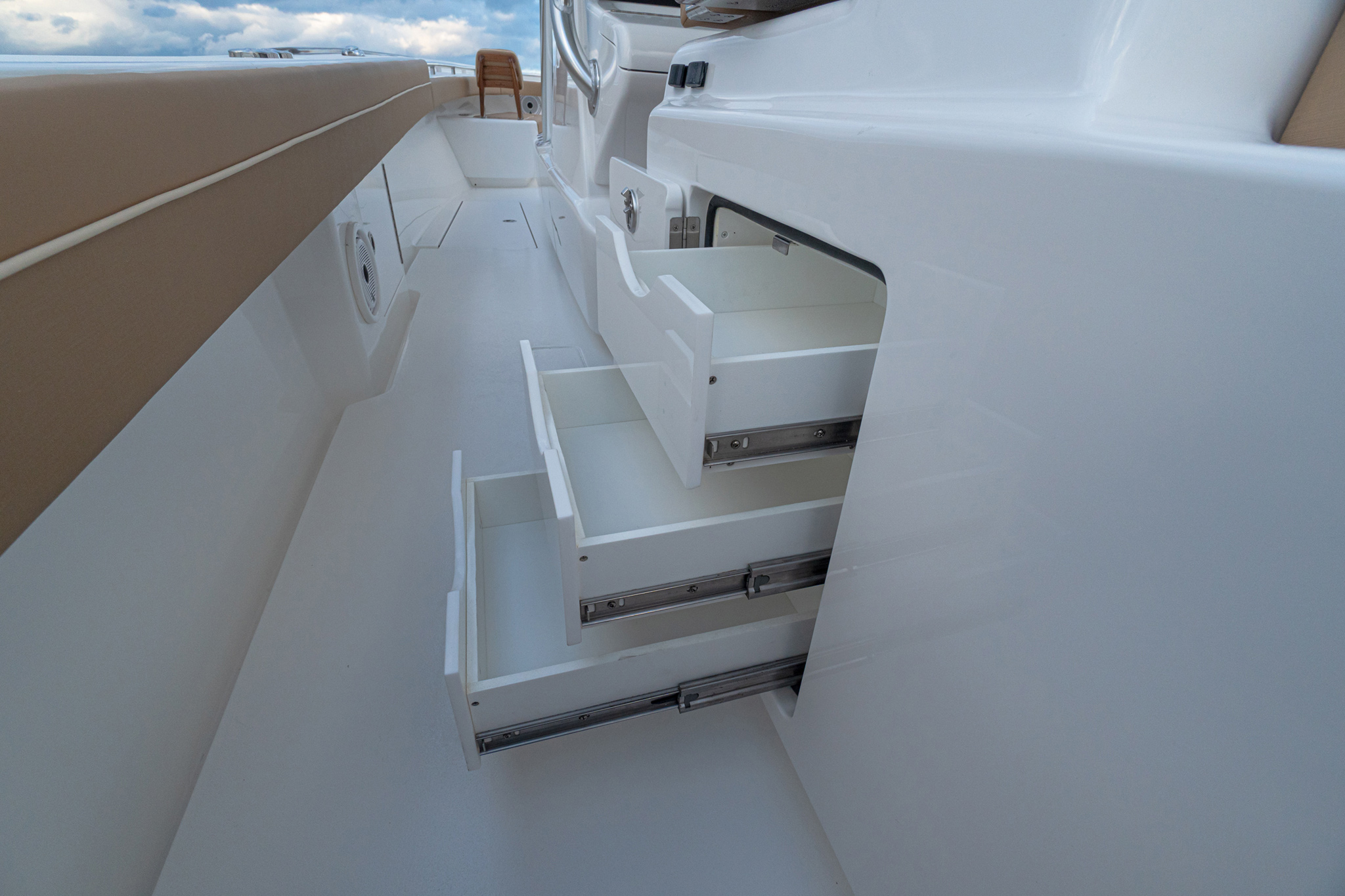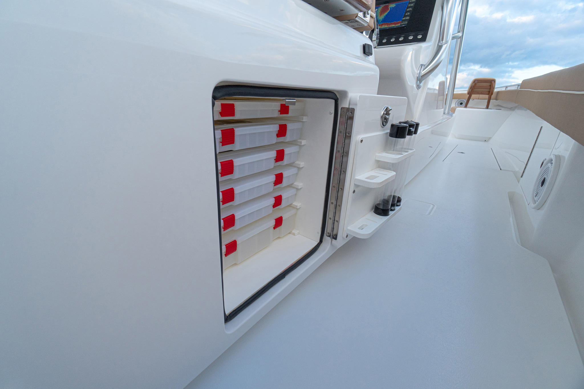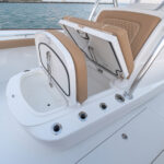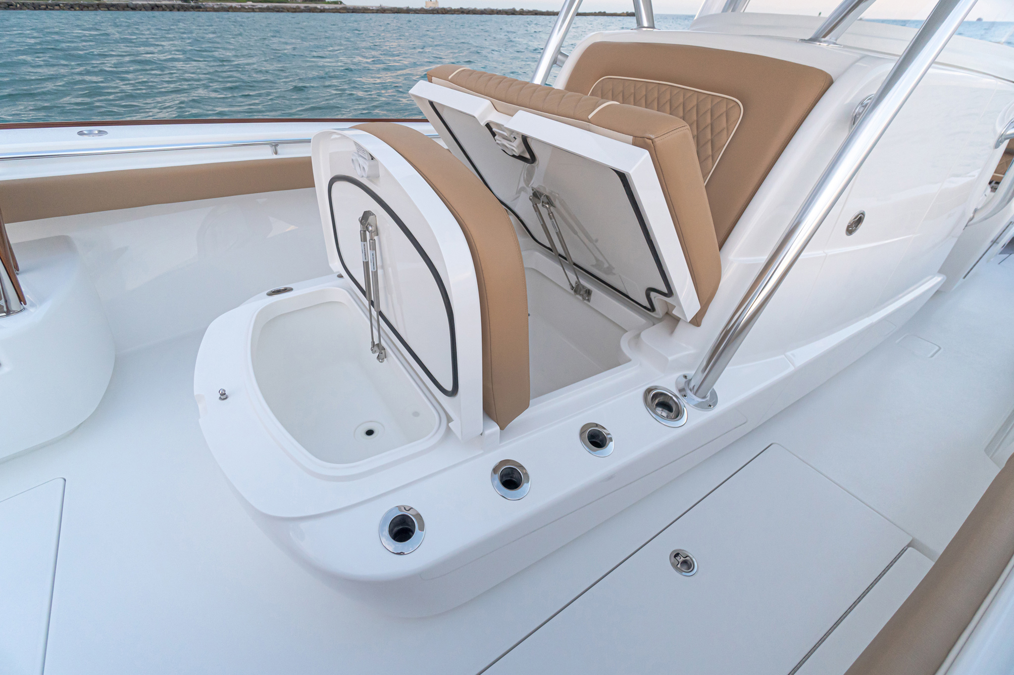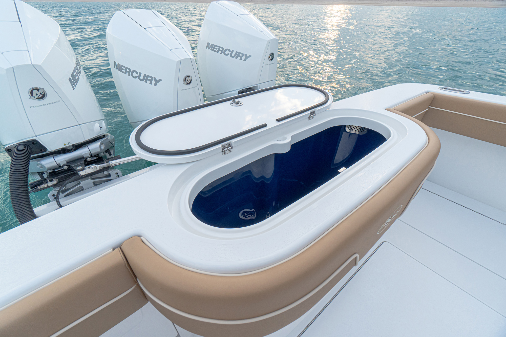 From stem to stern, you’ll find impressive standard storage and fishing features, including a 56-gallon transom live well and five overboard-draining in-deck fish boxes ranging from 45 to 123 gallons. You can swap out the forward lounge cooler for a raised live well, which provides quick access to bait while fishing from the bow. Other notable options include an additional live well in the cockpit deck, a dark blue transom live well interior to sustain bait life, 12V electric reel outlets, and live well inlet/discharge fittings in the transom corners.
