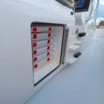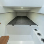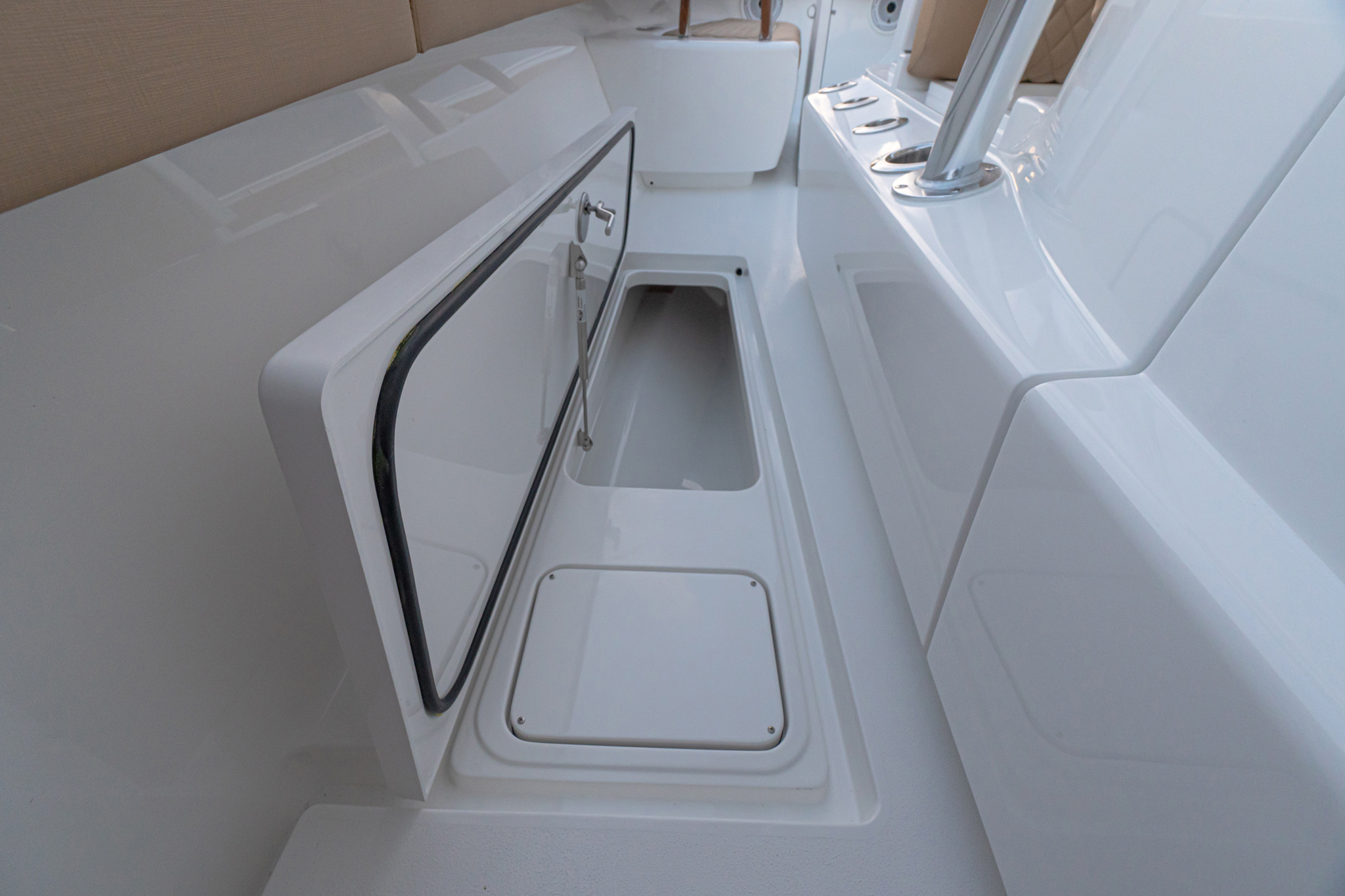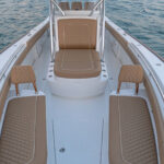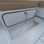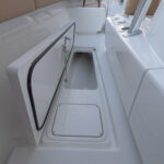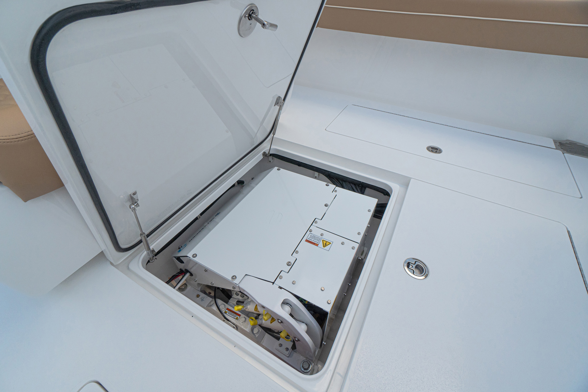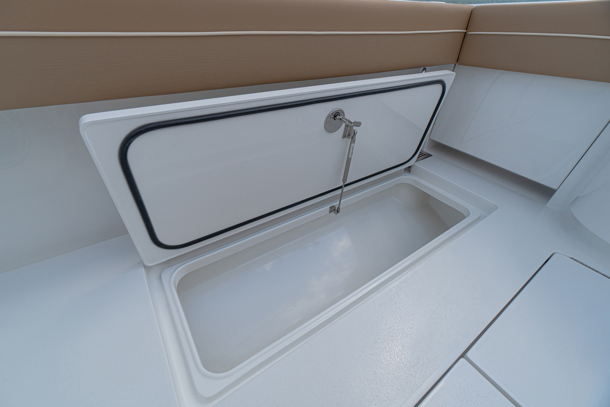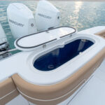 From stem to stern, you’ll find impressive standard storage and fishing features, including a 56-gallon transom live well and five overboard-draining in-deck fish boxes ranging from 45 to 123 gallons. You can swap out the forward lounge cooler for a raised live well, which provides quick access to bait while fishing from the bow. Other notable options include an additional live well in the cockpit deck, a dark blue transom live well interior to sustain bait life, 12V electric reel outlets, and live well inlet/discharge fittings in the transom corners.
