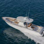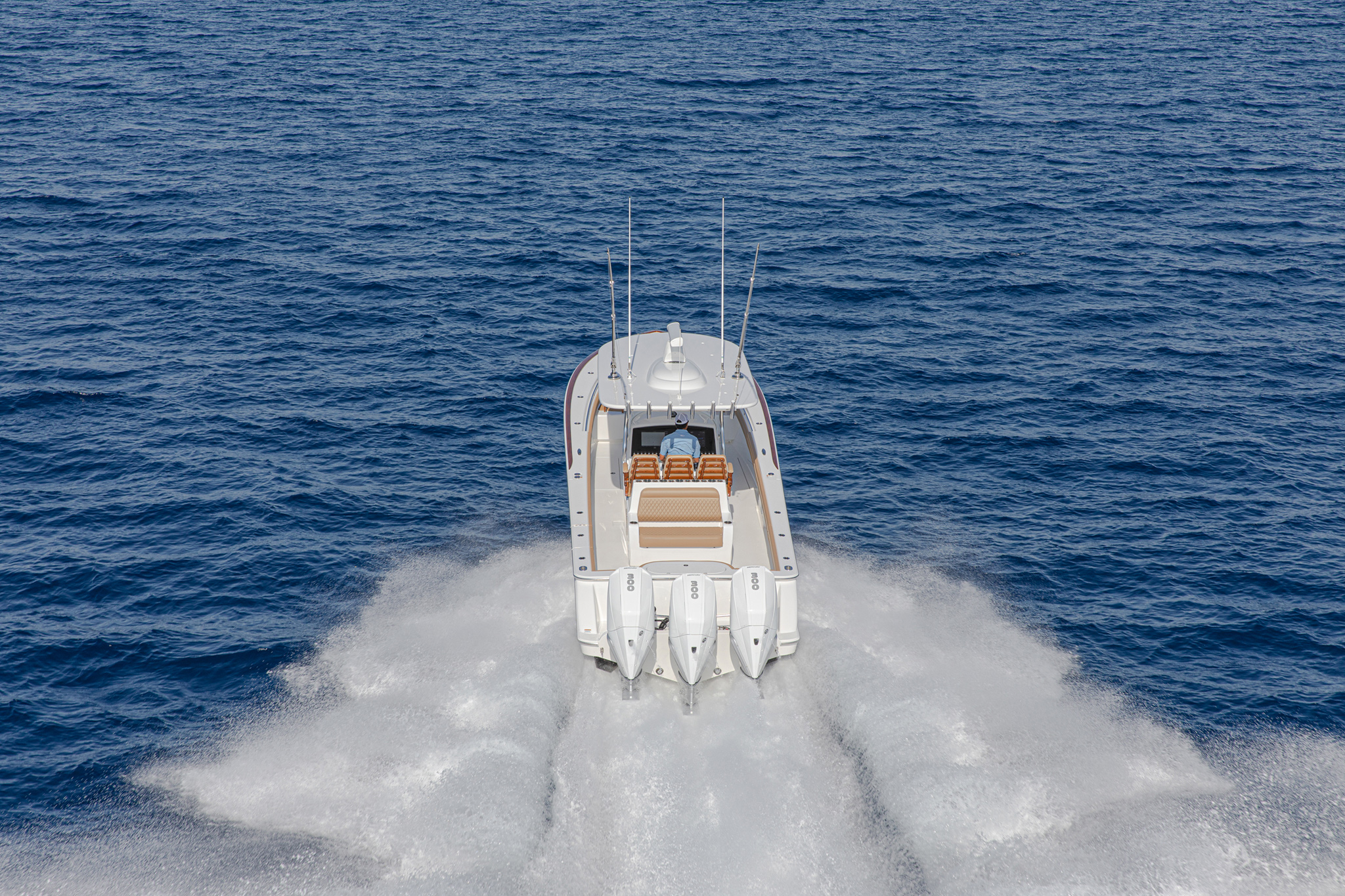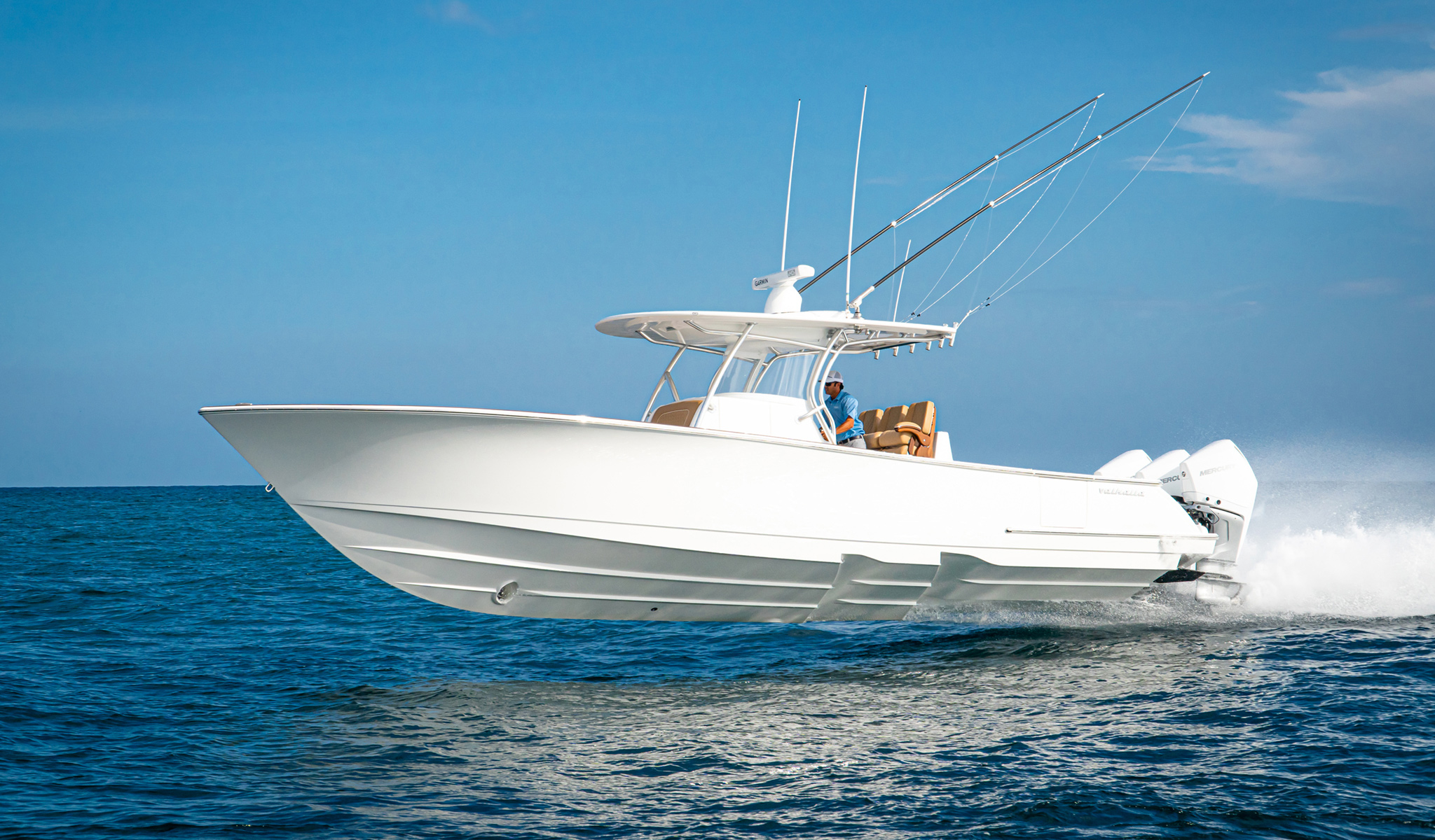 Hitting the sweet spot in the V Series lineup, the V-37 shines as a versatile coastal or offshore fish-raising thoroughbred with the legs to run long distances powered by either twin or triple outboards.