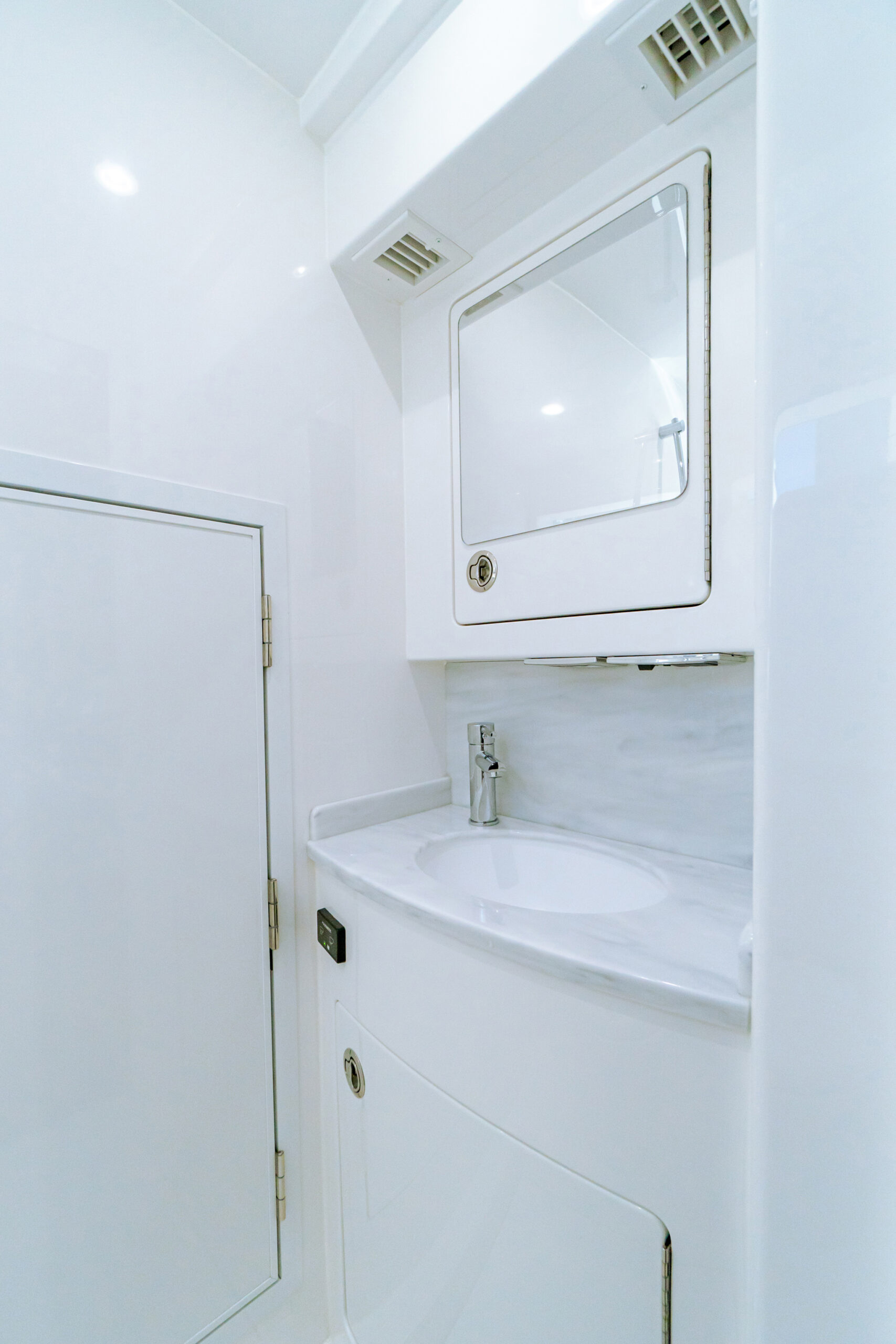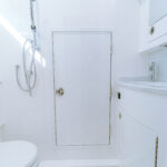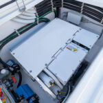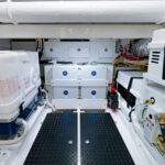 The head provides access to the machinery room. This protected stand-up space houses the 9 kW diesel generator, batteries and battery distribution panel, battery chargers, hot water heater, Delta T ventilation and fire suppression systems and other critical mechanical and electrical equipment and components. The helm electronics and the fuel management system’s manually operated valves are also accessed in the machinery room.
