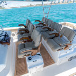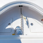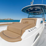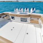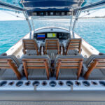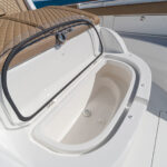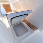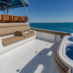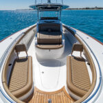 The three-person lounge integrated into the console has folding armrests and a leg-elevating design. There’s also a two-person seat molded into the lounge’s forward section. The port and starboard forward seats feature available Release Marine teak backrests. The deck layout was also designed with a centerline step-up platform for increased access to the anchor locker and ground tackle, and it also provides a convenient elevated position for casting.