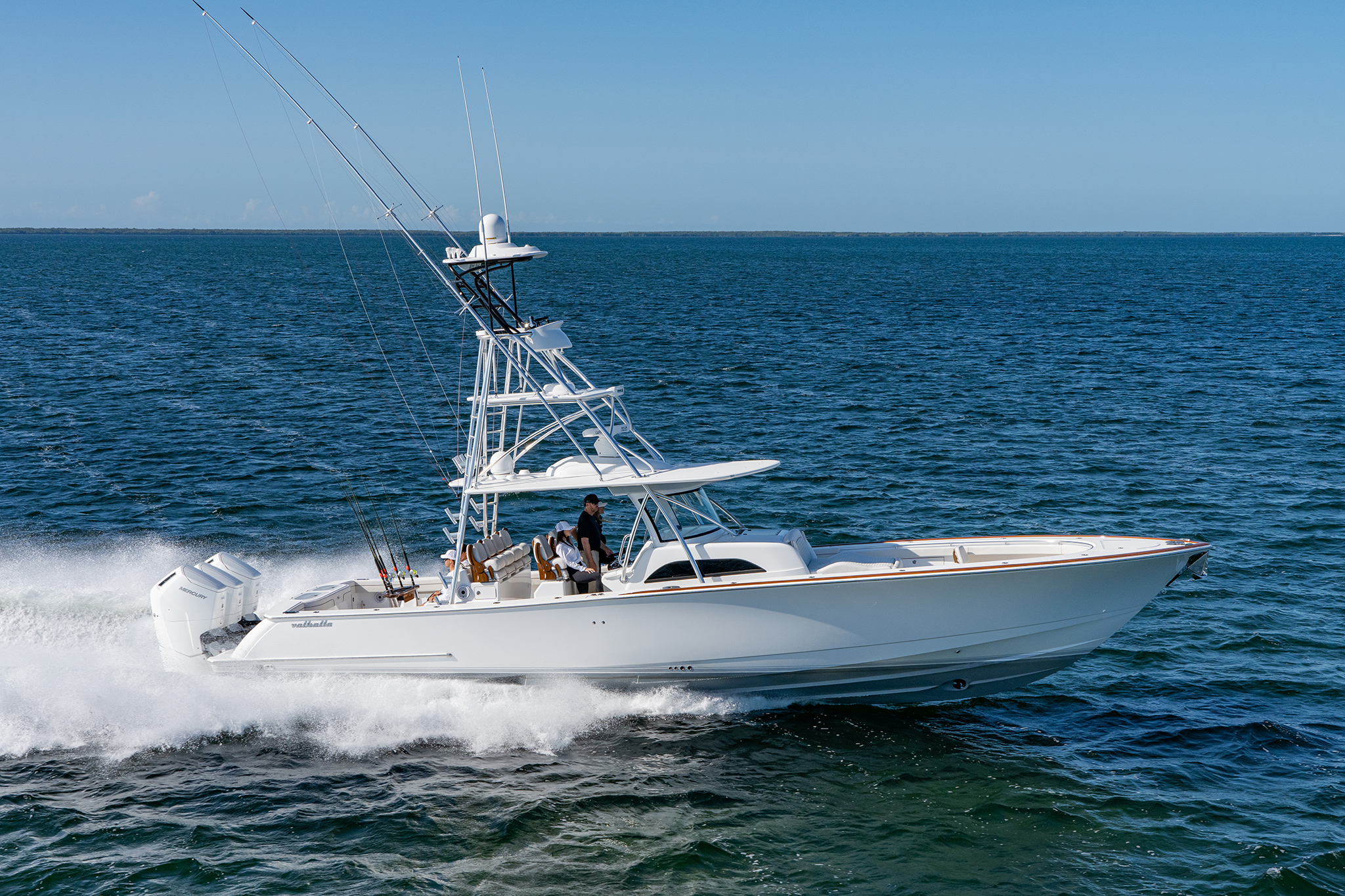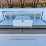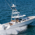 Aesthetic enhancements include a white powder-coated hardtop frame and the option to have the hardtop underside match the hull color. The Valhalla 46 can be outfitted with a custom Palm Beach Towers gap tower or fold-down Marlin tower with removable sunshade.