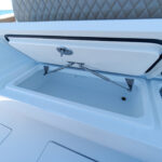 The V-46’s electrically operated fuel management system, which allows each outboard to draw from any of the three fuel tanks, and the Hooker sea chest can also be controlled from the helm. Fuel tank selector switches inside the port-side glove box give the operator the ability to “manage” the boat’s fuel load. Also in this glove box are the sea chest’s variable speed control knobs that adjust the live well flow rate. The starboard glove box is home to the optional joystick, available with all engine packages.