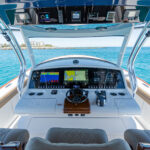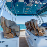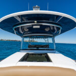 The hardtop package is loaded with top-shelf components for both fishing and navigation, including Lumitec Mirage spreader lights, overhead lights, a molded-in radar pod, a six-rod rocket launcher and an integrated overhead electronics pod in the hardtop above the helm. Custom hardtop options include Gemlux outrigger bases and 22′ Gemlux outriggers, Miya Epoch US-6 electric teaser reels (mounted inside the hardtop) and Lumitec Razor light bars.