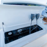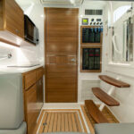 The V-46 was designed and engineered with a mounting structure molded into the vessel’s resin-infused structural stringer grid for the installation of an available Seakeeper 6. “Like the infused stringer grid, all of the materials used in the 46 are analyzed for weight reduction, optimal performance and ultimately the best structure we can provide,” says Lonni. The Seakeeper is accessed through a dedicated hatch on centerline forward of the lazarette, which is home to the Hooker sea chest live well system, fuel filters and various pumps, switches and manifolds (all with excellent accessibility). All hatches are equipped with heavy-duty gasketing that sits in recessed channels for a tight seal.