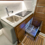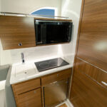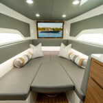 You’ll immediately notice the headroom (6′ 7″) and free-flowing open layout that’s filled with natural light flowing through four shapely portlights. Forward, a dinette with U-shaped seating and bolstered backrest surrounds a drop-down table that converts to a queen berth. On the starboard side is the galley, which features a polished Corian countertop, stainless steel sink, brushed nickel and chrome faucet, two-burner recessed stove, refrigerator/freezer, microwave oven and cabinet storage. Directly aft of the galley is the private head with a molded-in vanity with freshwater sink and faucet, toilet and shower.