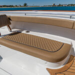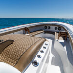 The seating opportunities on the V-46 are diverse and plentiful from bow to stern. Like the V-33, V-37 and V-41, the new Valhalla features standard Costa Marine bench seating at the helm with optional Release Marine or Llebroc seating consisting of three chairs with individual armrests, folding bolsters and electric slides. The V-46 also offers a second row of seating for up to four additional crew or guests, as well as the aft-facing mezzanine seating that has been so popular on the first three V Series models. Owners can also go with a Costa Marine bench for the second row of seating or four Release Marine or Llebroc chairs with shared armrests, folding bolsters and electric slides. The second row is elevated another 3 inches and has a footrest area for enhanced visibility and comfort. GG Schmitt transom seats are also available. VBW uses premium Sunbrella Horizon upholstery – offered with Diamond/Bentley stitching – for the V-46’s seating and coaming bolsters. The seating’s main sections, insets and piping can all be color coordinated to the owner’s liking.