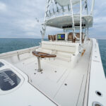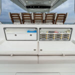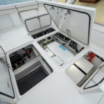 The twin insulated 110-gallon fish boxes – which can be refrigerated – flank the centerline Seakeeper hatch and the lazarette – both finished with a white gelcoat for better visibility and maintenance. Fuel filters; bilge pumps and switches, live well and fish box pumps; live well manifolds; the Hooker Sea Chest System; Reverso automatic outboard freshwater flush system and other components are expertly installed, neatly labeled and readily accessible in the lazarette.