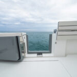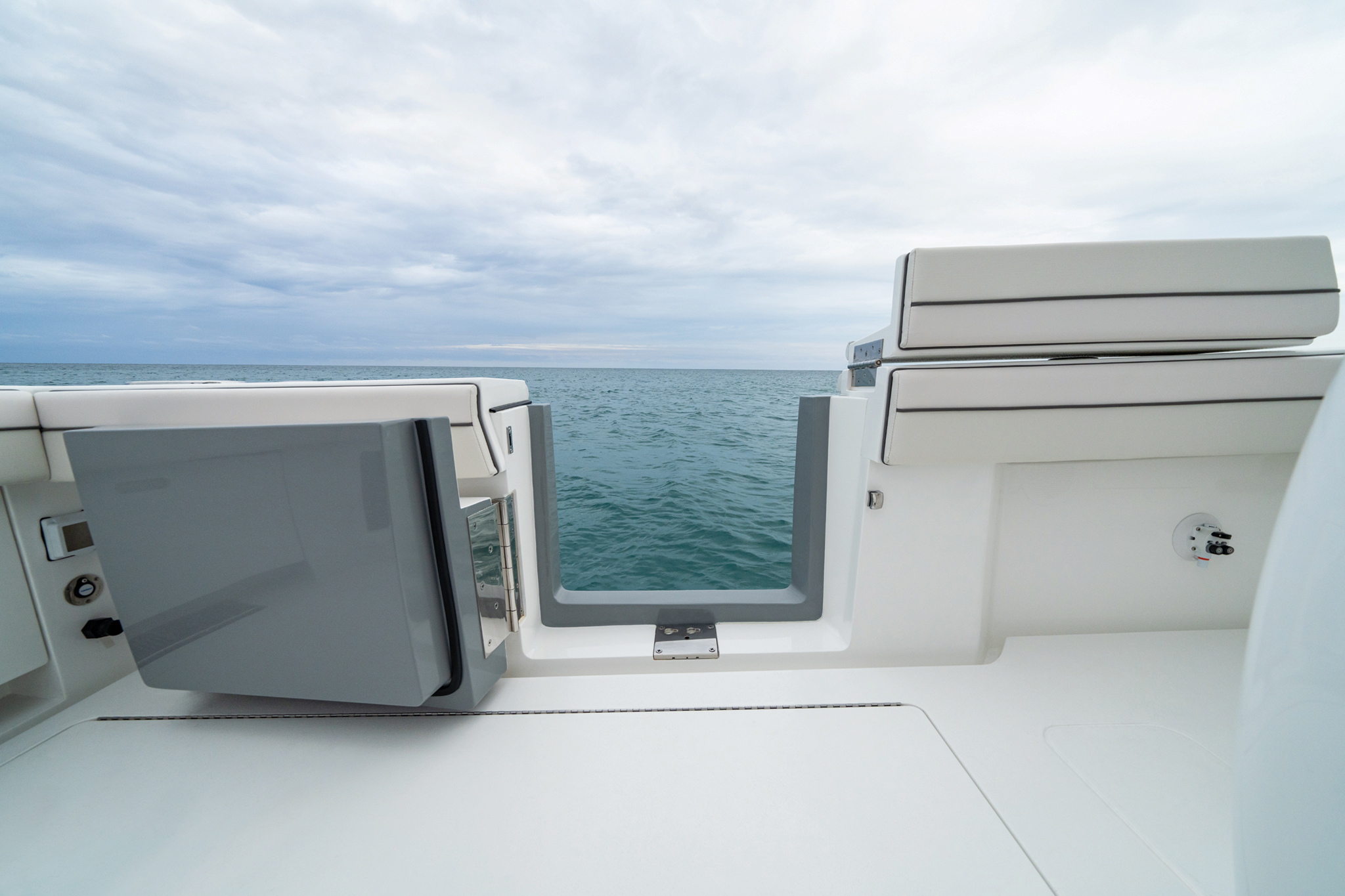 A companionway leads to the air-conditioned cabin. Its location – on the console’s starboard aft end – and its sliding door are similar to a Viking express yacht, providing easy access and the ability to run safely with the door open or closed.