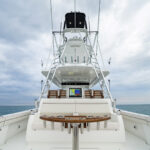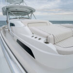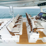 Alternatively, fish-focused owners may prefer the optional second row seating module with five Release Marine teak chairs and its additional tackle storage and cooler space. With each arrangement, the second row’s fiberglass seating module includes an aft-facing mezzanine seat with refrigeration underneath, a row of rod and cupholders, tackle storage, a drink box to port and a sink to starboard with the availability of an optional grill. Also available with the five-chair module is an optional 24-inch multi-function display, located on centerline that lifts up and faces the cockpit.
