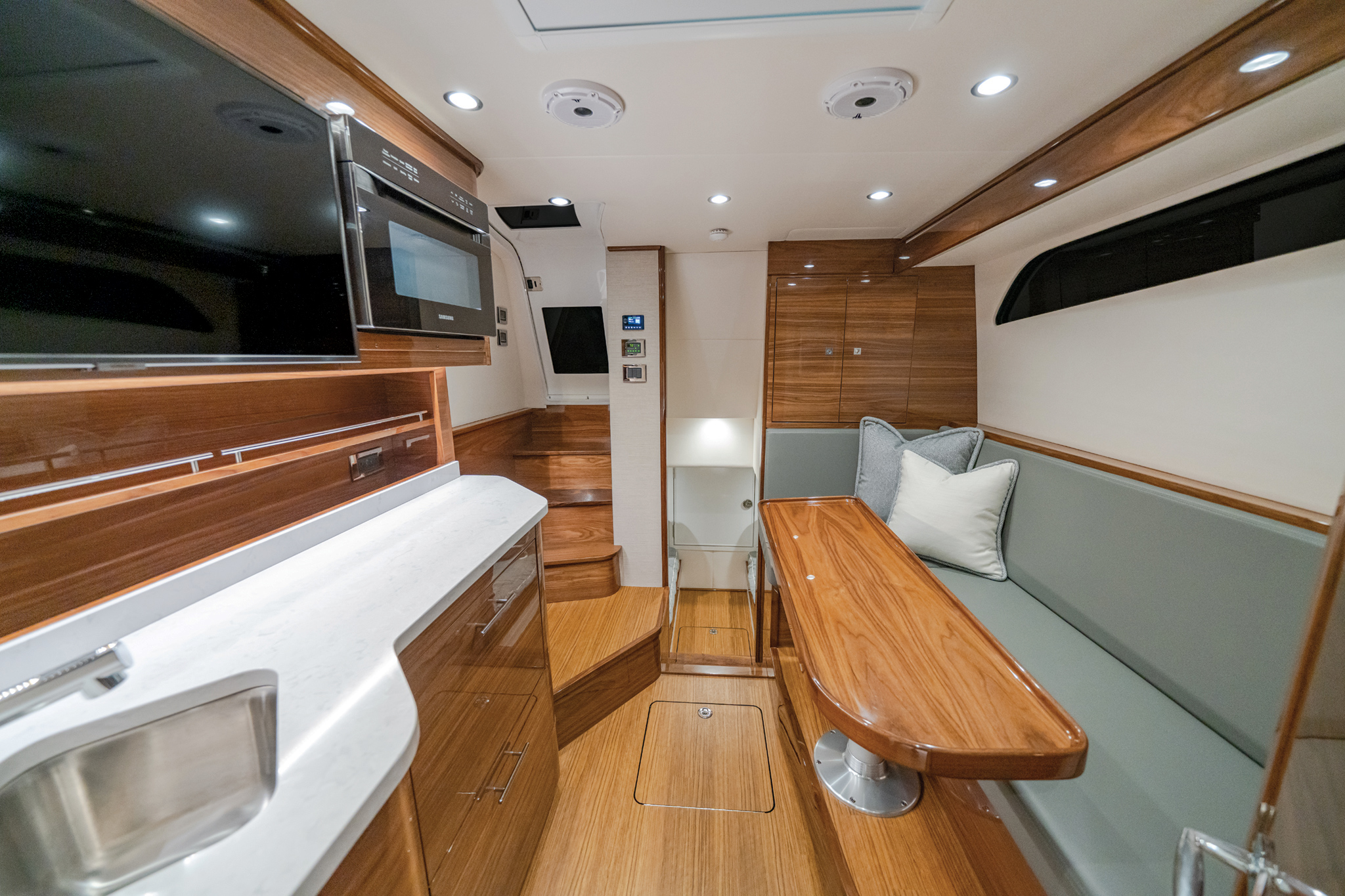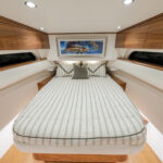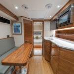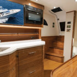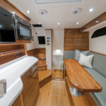 The V-55’s accommodations below expand the use of wood and amenities, bringing an enhanced level of yacht-like luxury akin to a Viking interior. A Bomar overhead hatch and two portlights on each side of the cabin usher in an abundance of natural light, heightening the appeal of the horizontal grain walnut.