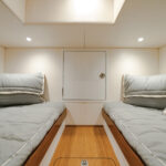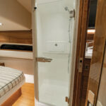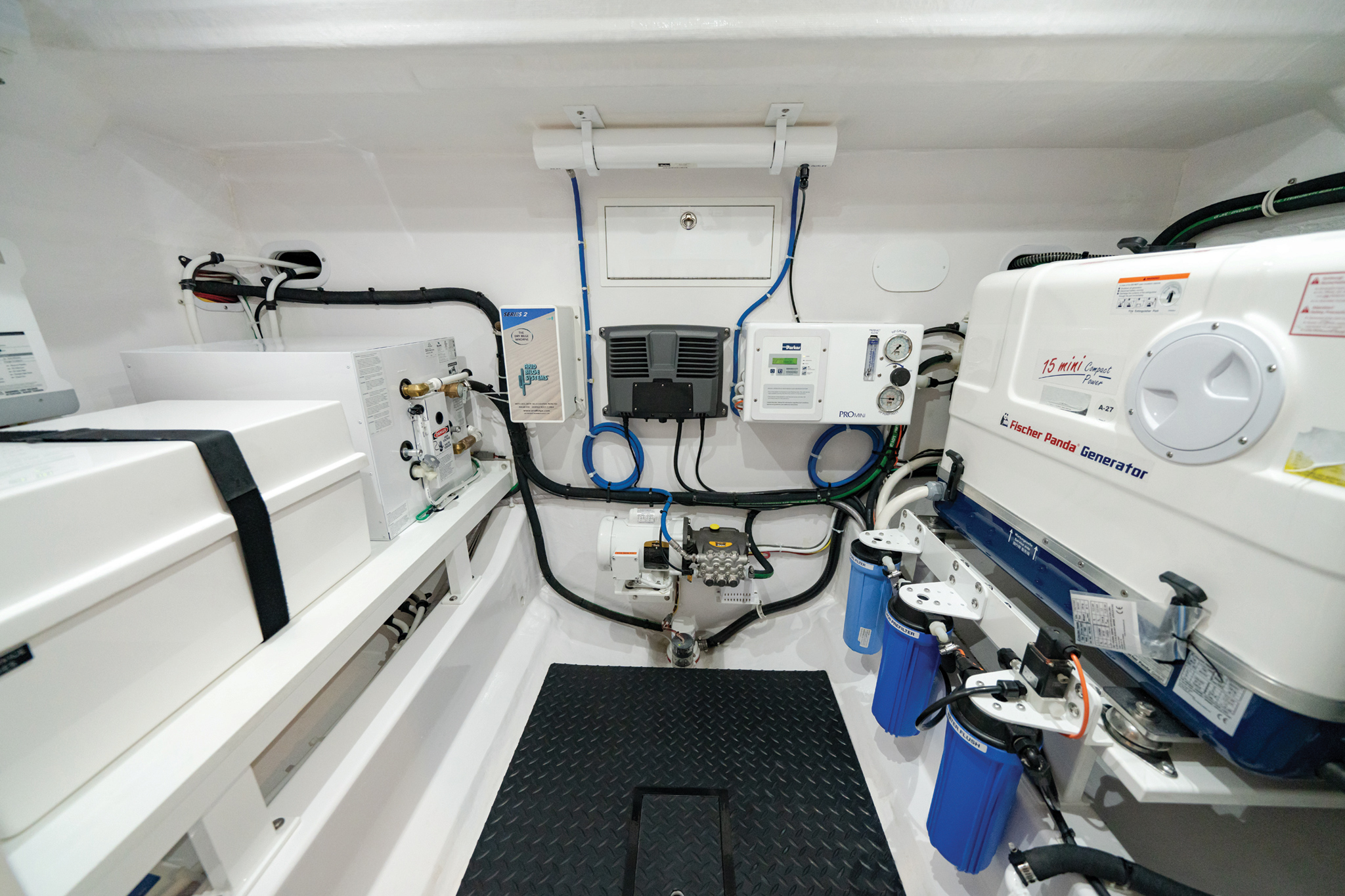 With the V-46, VBW was the first to design and engineer a large designated dry space for mechanical and electrical components – a “machinery room.” Accessed through an aft bulkhead door in the bunk area, the V-55’s machinery room contains the batteries and battery chargers, fire and ventilation systems, water heater, battery switches, generator, access to the electronics, fuel management systems as well as optional systems including a watermaker, Spot Zero water purifier and sonar tube. A 15 kW genset was chosen as standard equipment to ensure ample power for air conditioning, refrigeration and operation of a Seakeeper 9.