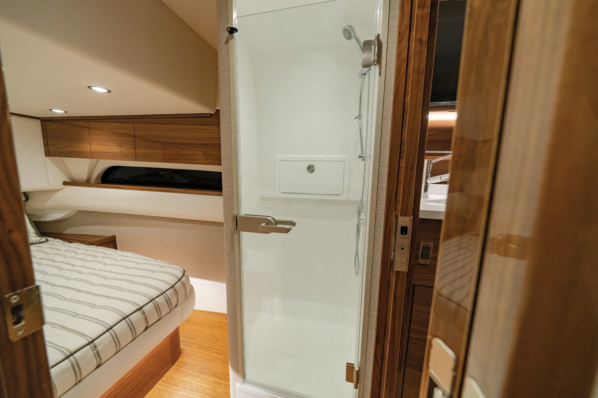 The cabin has ample headroom and is appointed with a feature-rich galley to starboard and an L-shaped lounge on the port side with a drop-down dinette table for conversion into a bunk. A standard 32-inch HD TV faces the dinette. The forward area is dedicated to the private stateroom with its raised walk-around queen bed (with storage underneath); 24-inch HD TV; port-side ensuite head with vanity and sink; and separate enclosed shower on the stateroom’s starboard side. The layout also makes the head accessible from the cabin interior. Moving aft, there’s a bunk area with a pair of single berths, each 6 feet, 3 inches long – perfect for a couple, kids or anglers.