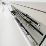 The optional power-actuated twin bow tables are perfect for lunch or drinks, and can be lowered to create one large sunpad. “In this area, we’ve added a versatile cruising amenity while still providing accessibility forward,” says David. “The split design allows egress to the step-up platform, anchor locker and bow cleats without having to remove the tables.”