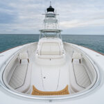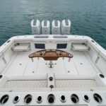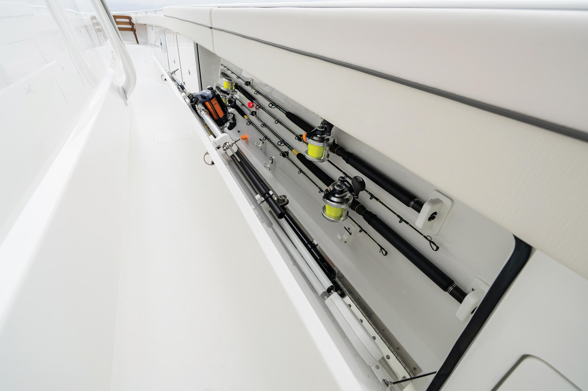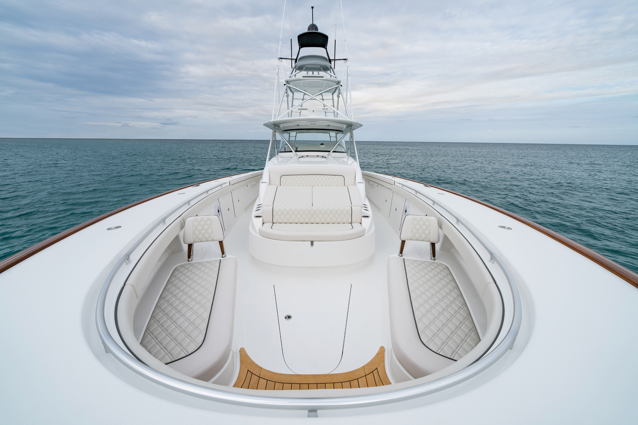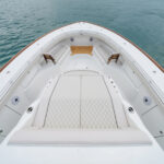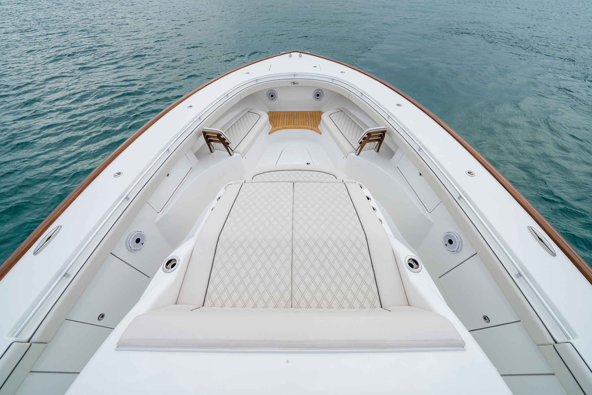 Wide sidedecks lead to the bow. A lounge (with armrests and cupholders) is integrated into the console and comfortably seats three guests. There’s an additional seat on the forward end that can hold an available live well. A pair of forward seats with optional teak backrests are to port and starboard, allowing a clear path to the 186-gallon in-deck fishbox, centerline step-up casting platform and access to the anchor locker, windlass and ground tackle.