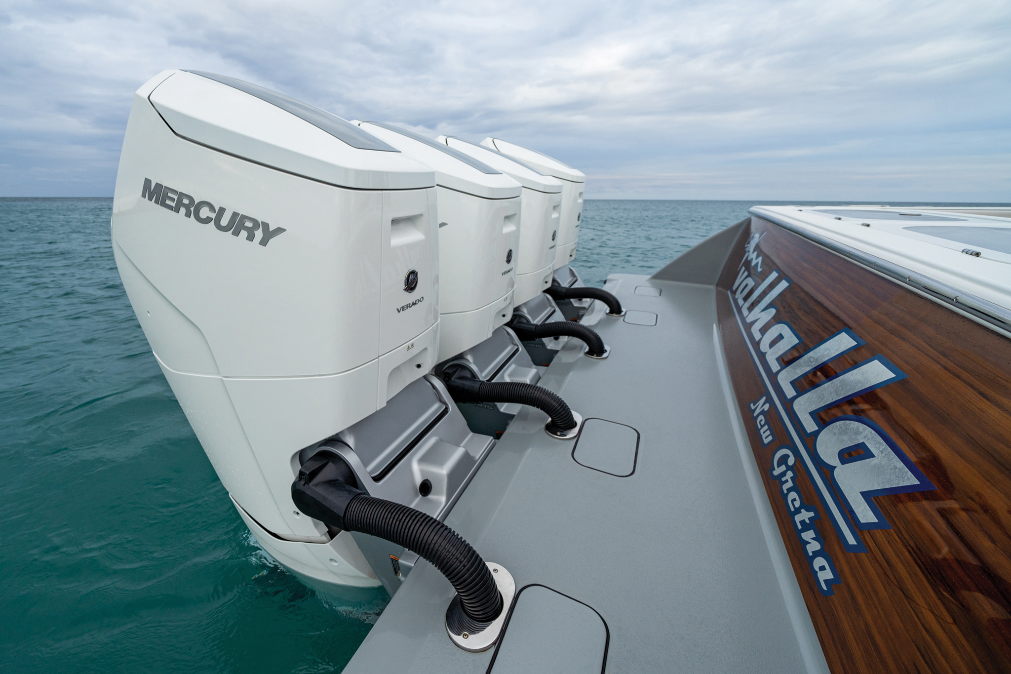 The V-55 will thrive in a variety of roles, from offshore tournament contender, fish-and-cruise family center console to high-speed sport yacht. Our new flagship was designed and built specifically for Mercury’s innovative V-12 600-hp outboards (four or five engines). The quads push the V-55 (with a gap tower) to a top speed of 64 mph, and 68 mph with a hardtop and no tower. With quints, the boat (with hardtop and no tower) hits 73-74 mph at WOT. And with a 1,200-gallon fuel capacity – about 200 to 300 gallons more than competing models – the Valhalla 55 delivers greater range than other center consoles in its size range. The boat is also engineered with an electrically operated fuel management system, providing increased reliability and utility by allowing each engine to draw from designated fuel tanks.