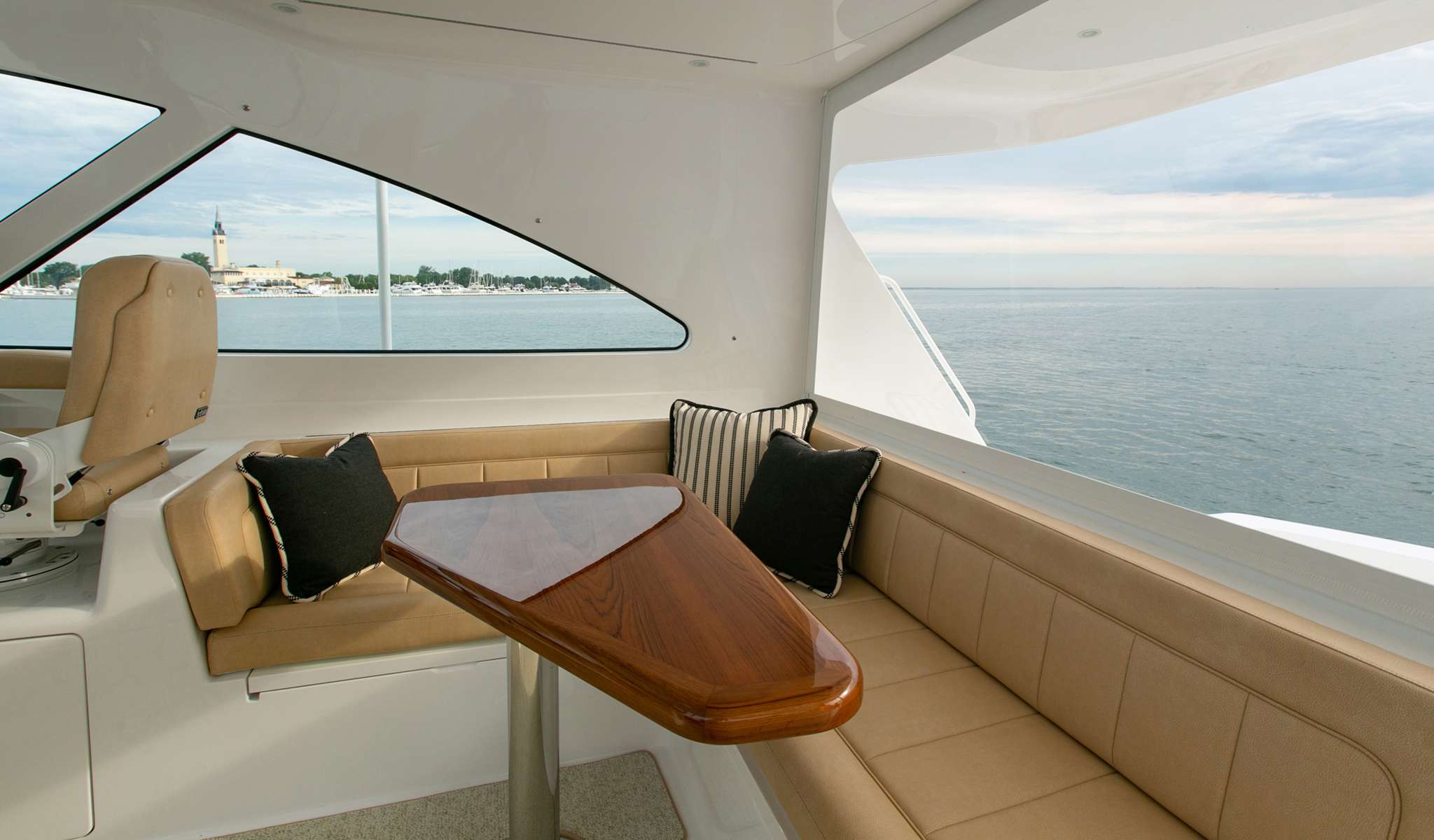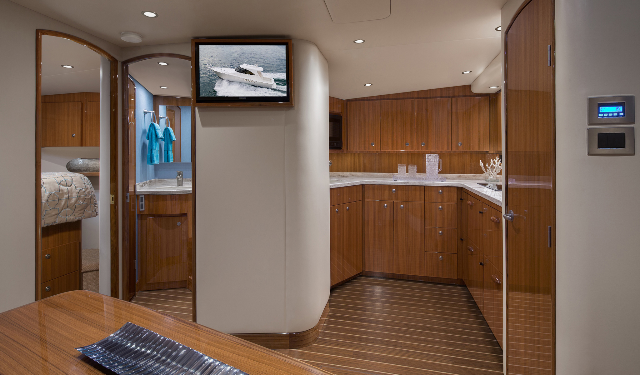 A sliding companionway door and a large set of stairs with a starboard-side vertical handrail lead to the climate-controlled salon. With its 16 ft. 4 in. beam, the widest of any boat in this class, the salon is a spacious social area for relaxing and entertaining. The starboard-side galley, which sits opposite an L-shaped lounge with a dinette table, includes teak cabinetry with meticulous joinery and fit and finish, expansive Corian countertops, an electric range, separate under-counter refrigerator and freezer units and a microwave/convection oven. Other notable amenities include a stereo system with a 24-inch flat screen HD TV.