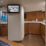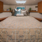 In the forward master stateroom, the island queen bed with mattress has a lift-up top with gas pistons and maple-lined storage underneath. There’s also a maple-lined hanging locker. Air conditioning, a 19-inch flat screen television and access to the head and shower round out the standard amenities.