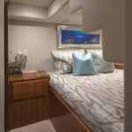The head has custom Amtico flooring, a one-piece molded Corian countertop with rounded edges and a sink with a satin nickel faucet. With its two-person berth, the aft guest stateroom can accommodate another couple and makes for a nice hideaway for the kids.
