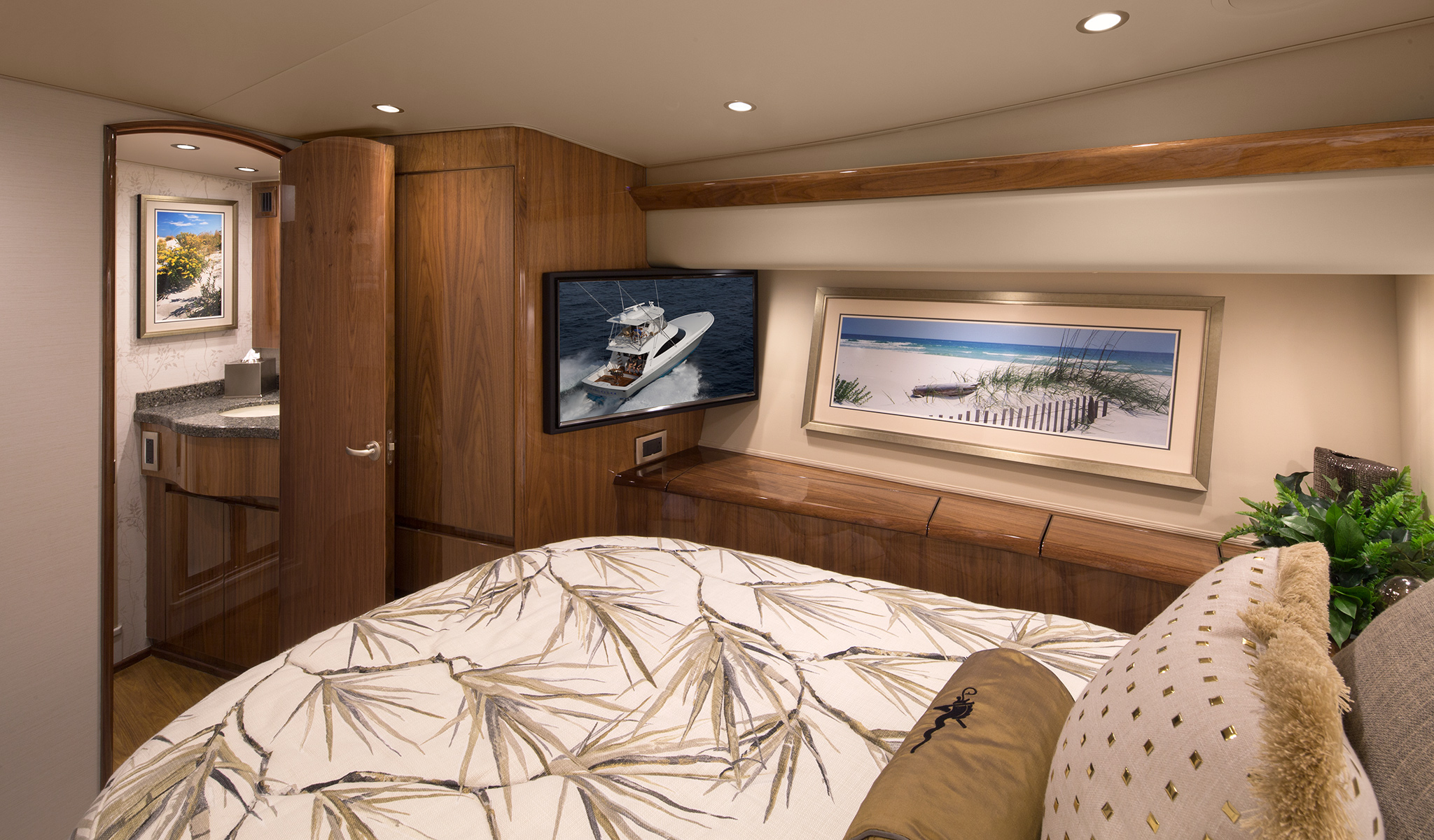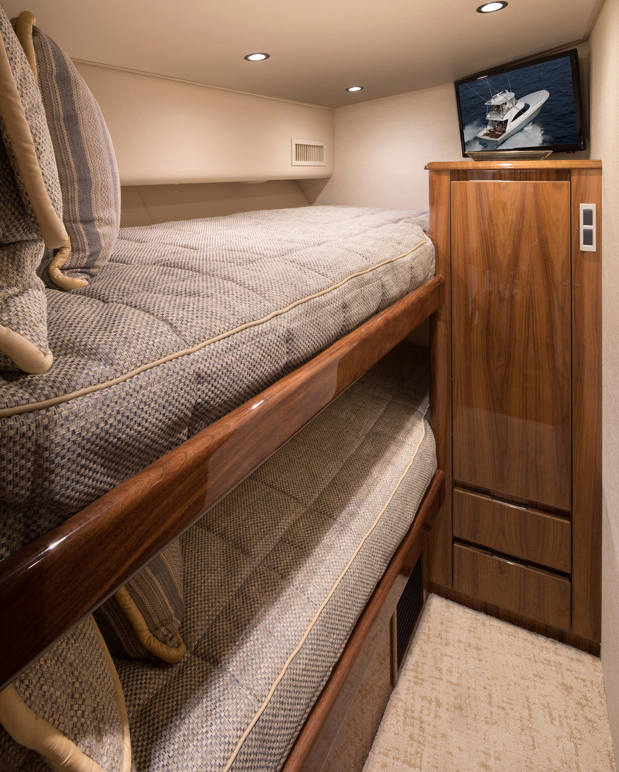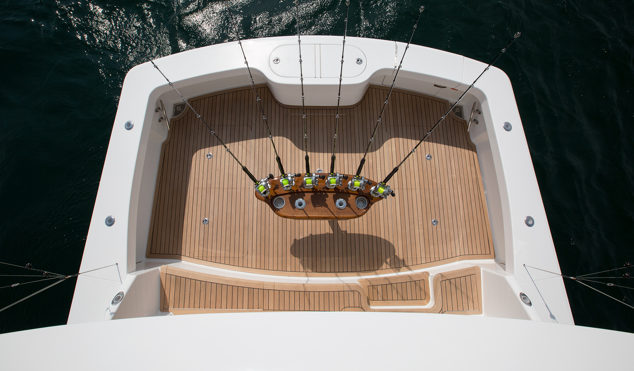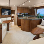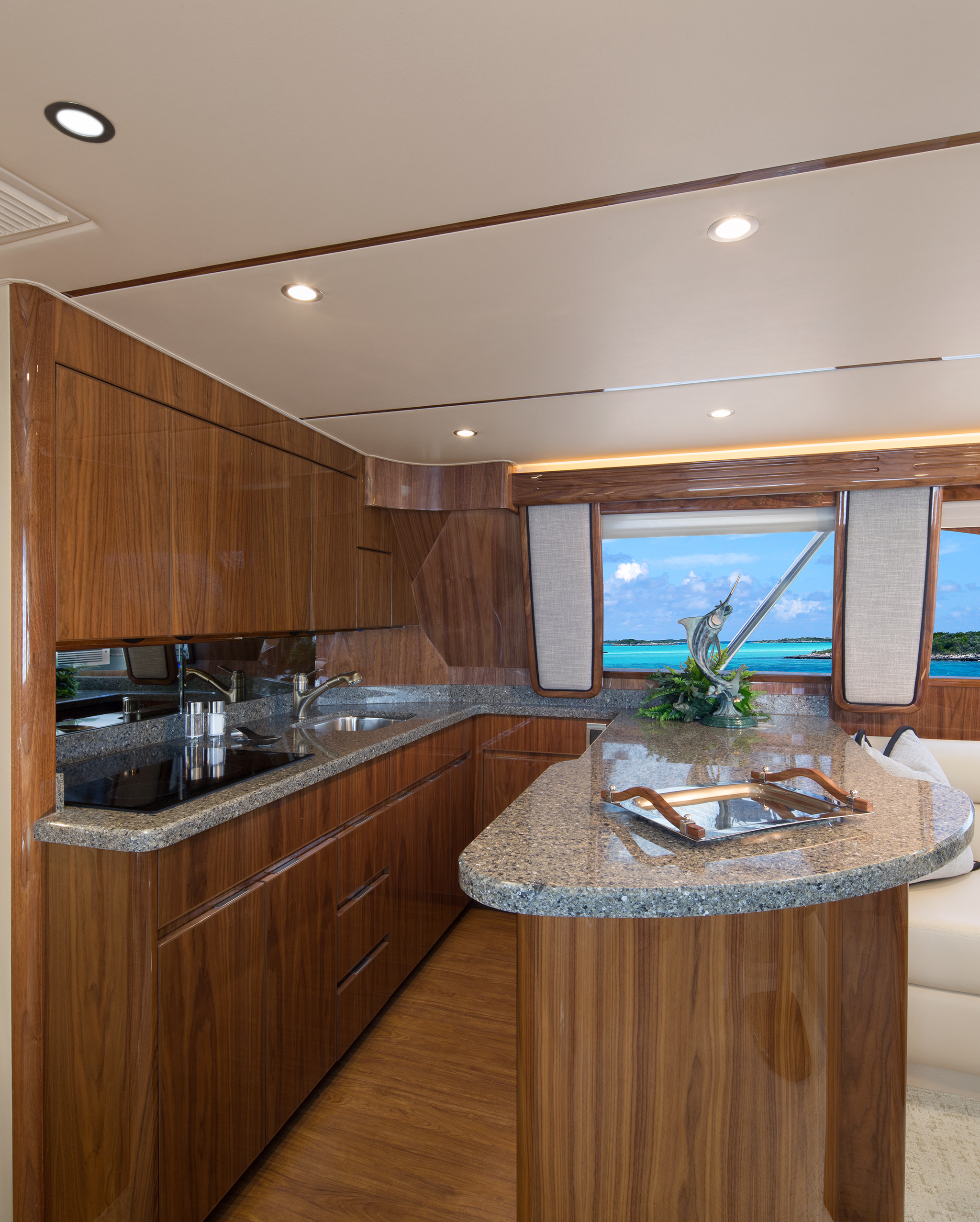 The lush interior is rich in detail with our signature hand-finished teak or walnut joinery depending upon the owner’s selection. Taking advantage of the spacious beam, the salon abounds with stylish appointments throughout the salon with an L-shape lounge and cocktail table, as well as an inviting dinette, which anchor the area for relaxing and entertaining. To starboard the peninsula galley has a raised bar top and is accented with Cambria treatments, under counter refrigeration, a microwave/convection oven and ample stowage behind the maple-lined cabinetry. Overnight accommodations are plush with three staterooms and two heads providing all the comfort and privacy you need for fishing and cruising in style. A laundry center and central vacuum system add sophisticated convenience.