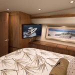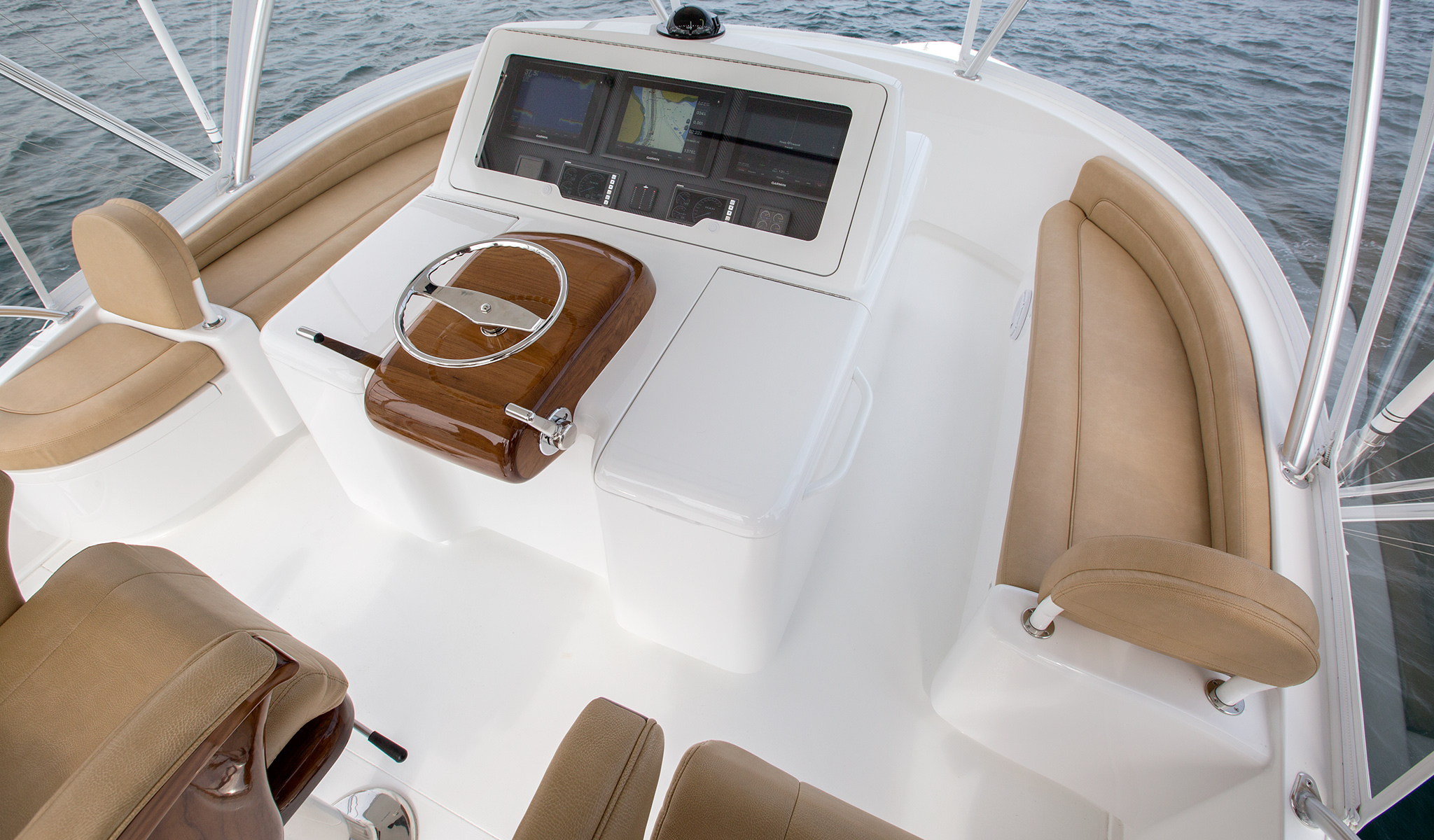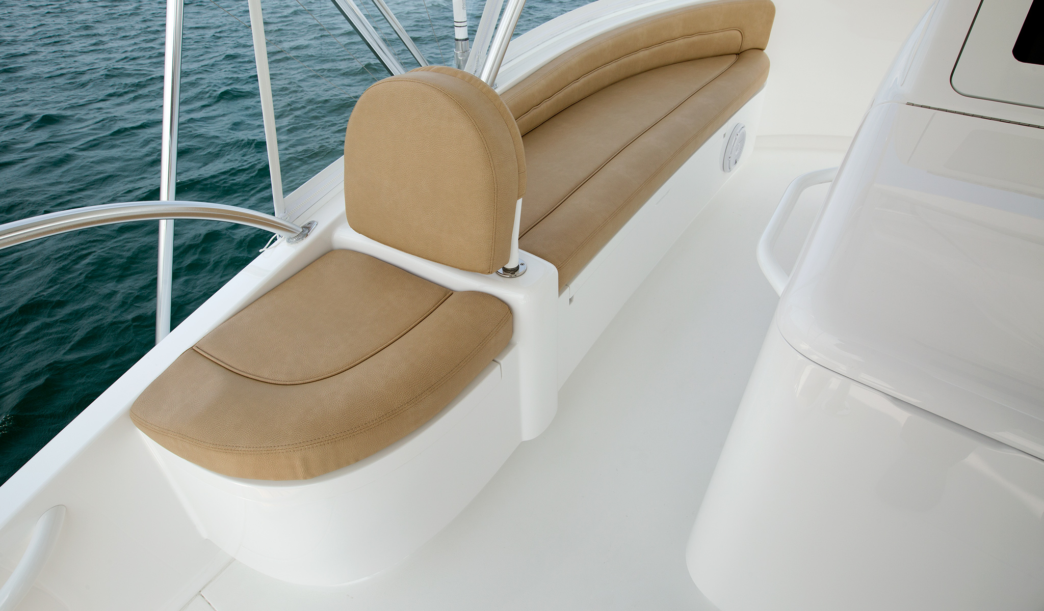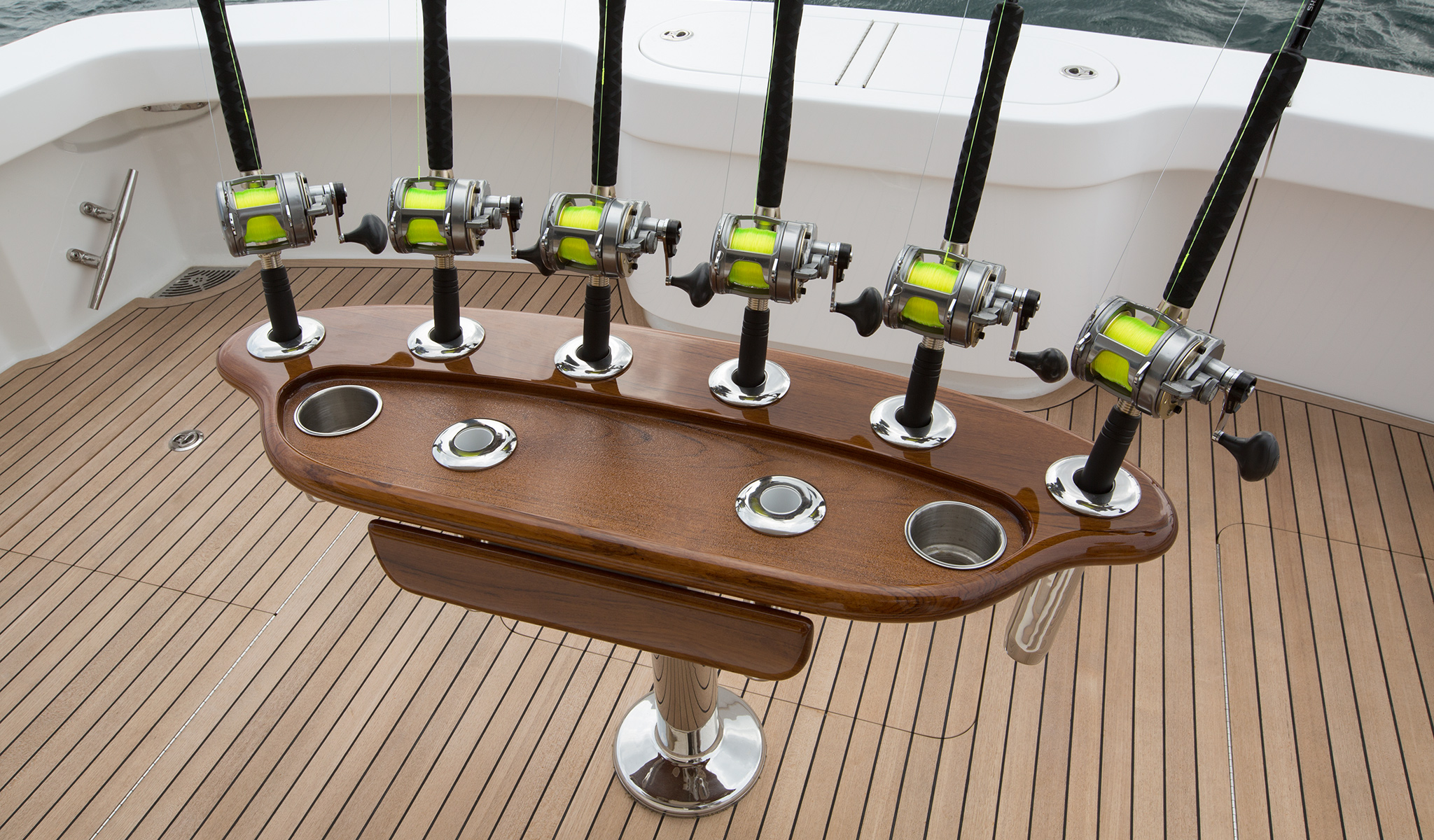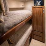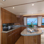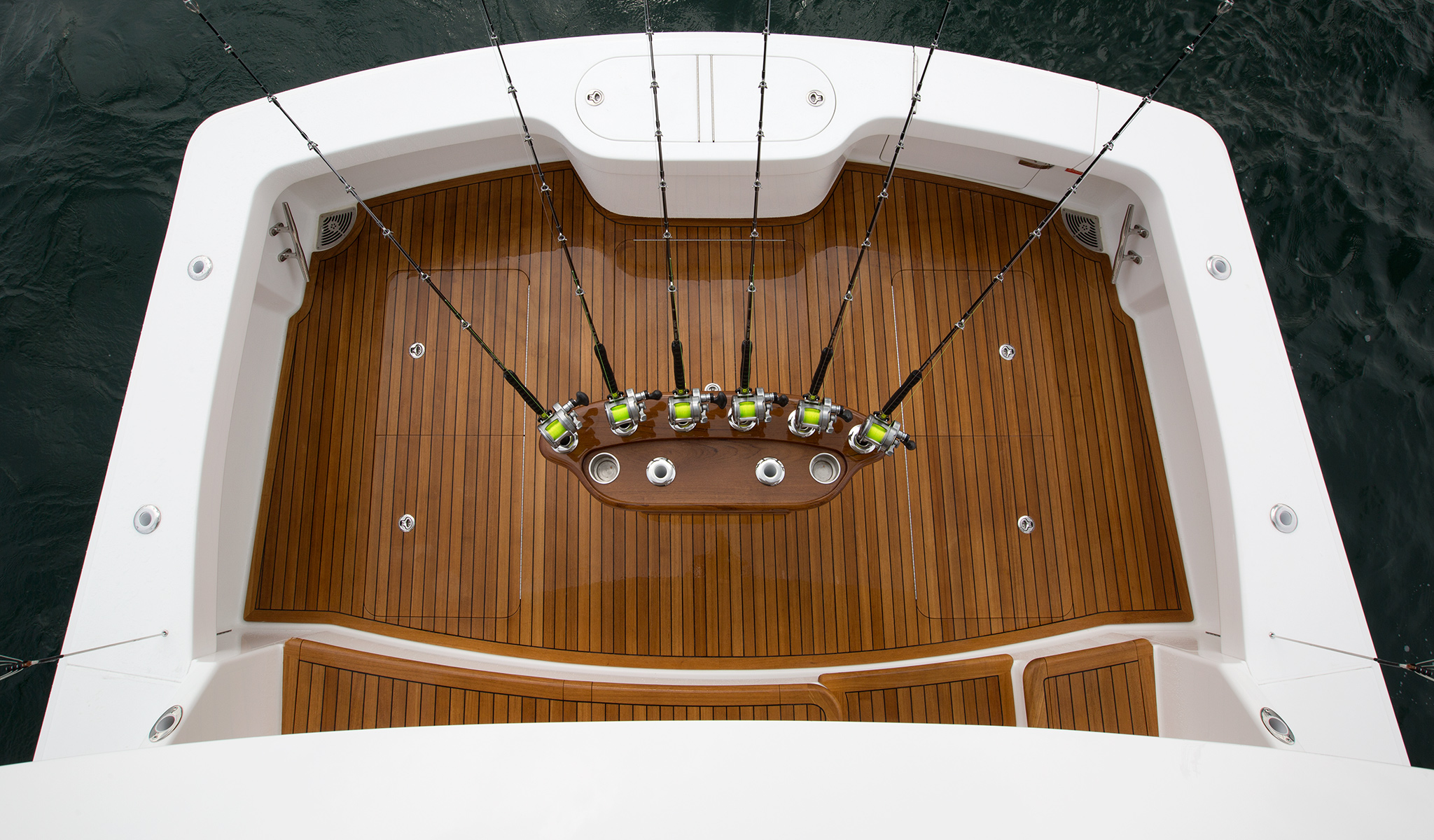 The lush interior is rich in detail with our signature hand-finished teak or walnut joinery depending upon the owner’s selection. Taking advantage of the spacious beam, the salon abounds with stylish appointments throughout the salon with an L-shape lounge and cocktail table, as well as an inviting dinette, which anchor the area for relaxing and entertaining. To starboard the peninsula galley has a raised bar top and is accented with Cambria treatments, under counter refrigeration, a microwave/convection oven and ample stowage behind the maple-lined cabinetry. Overnight accommodations are plush with three staterooms and two heads providing all the comfort and privacy you need for fishing and cruising in style. A laundry center and central vacuum system add sophisticated convenience.