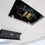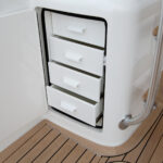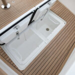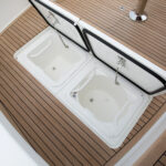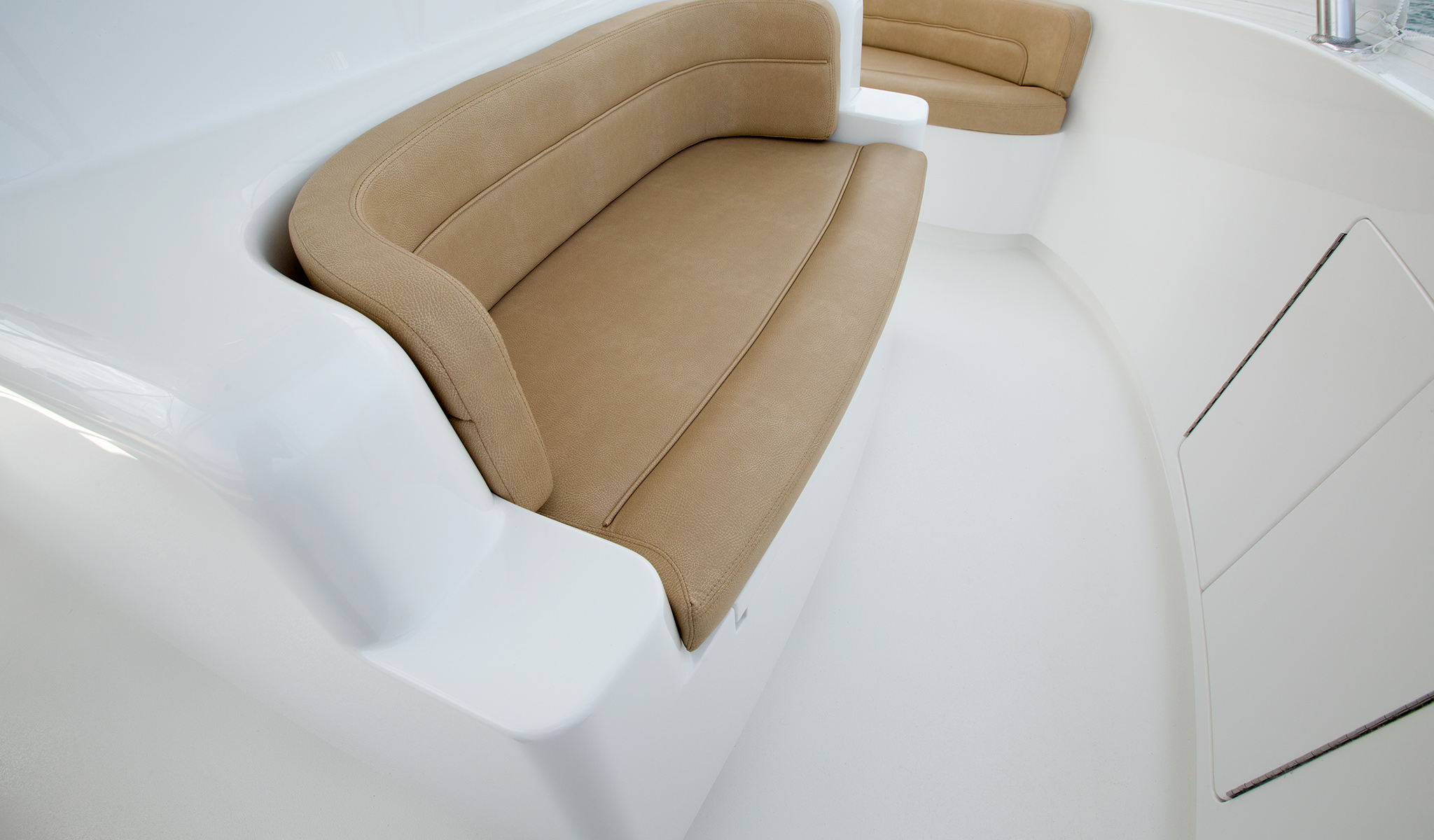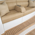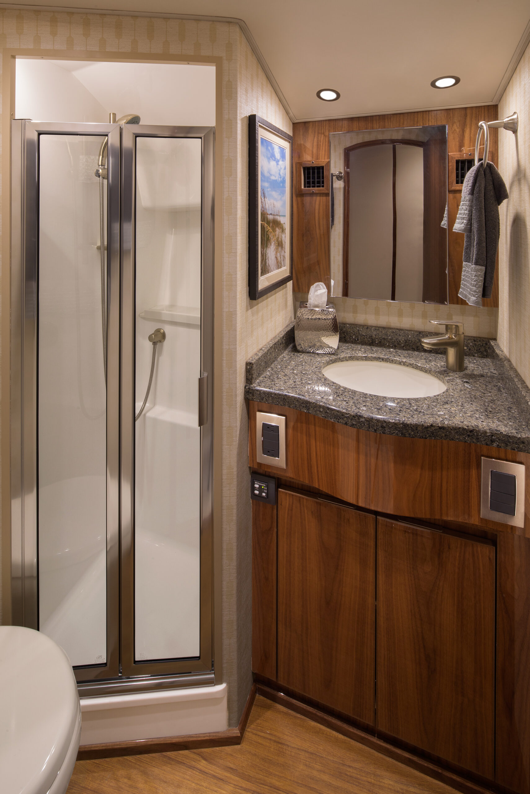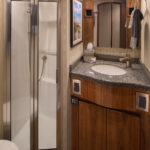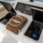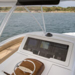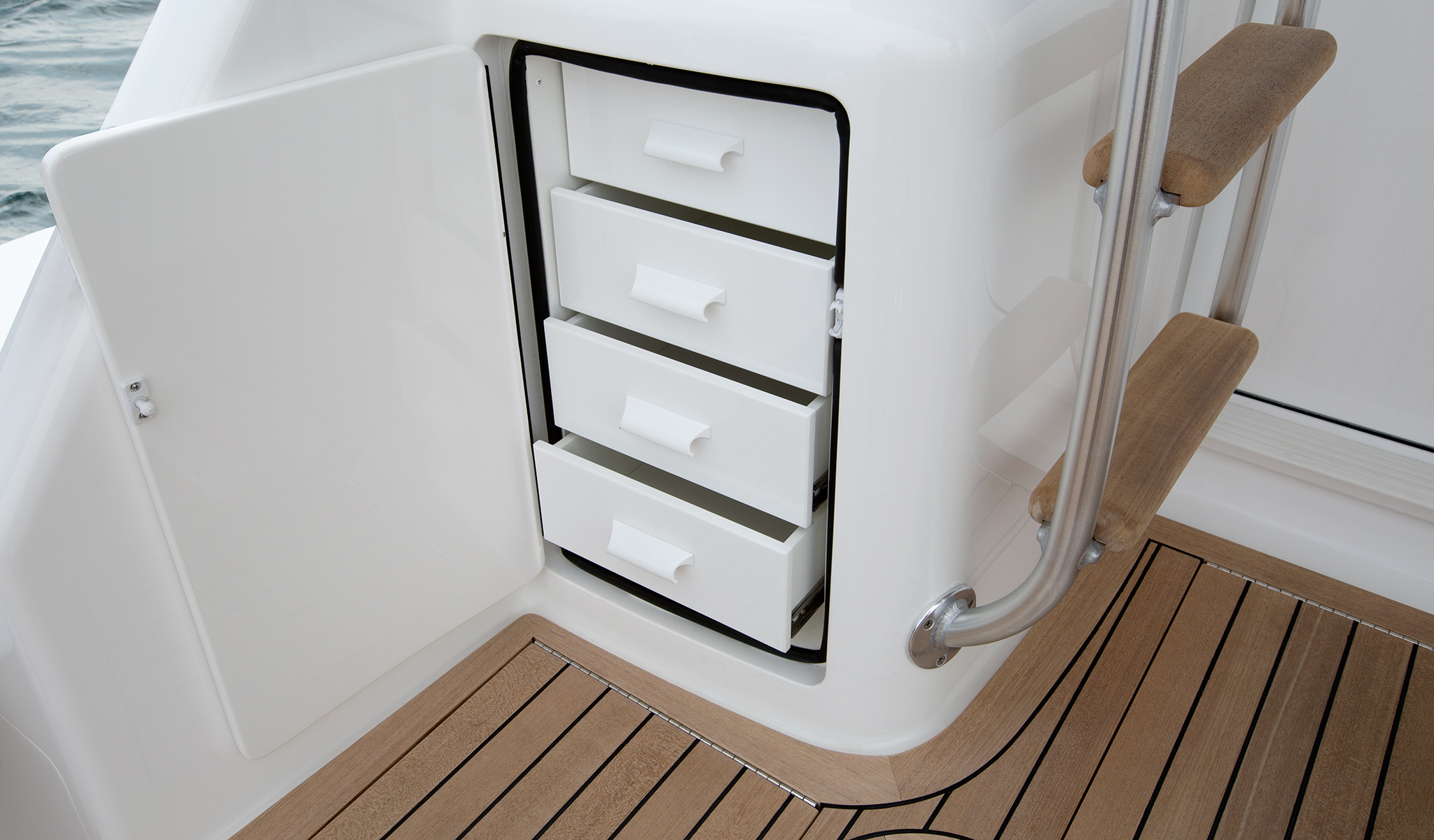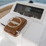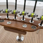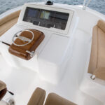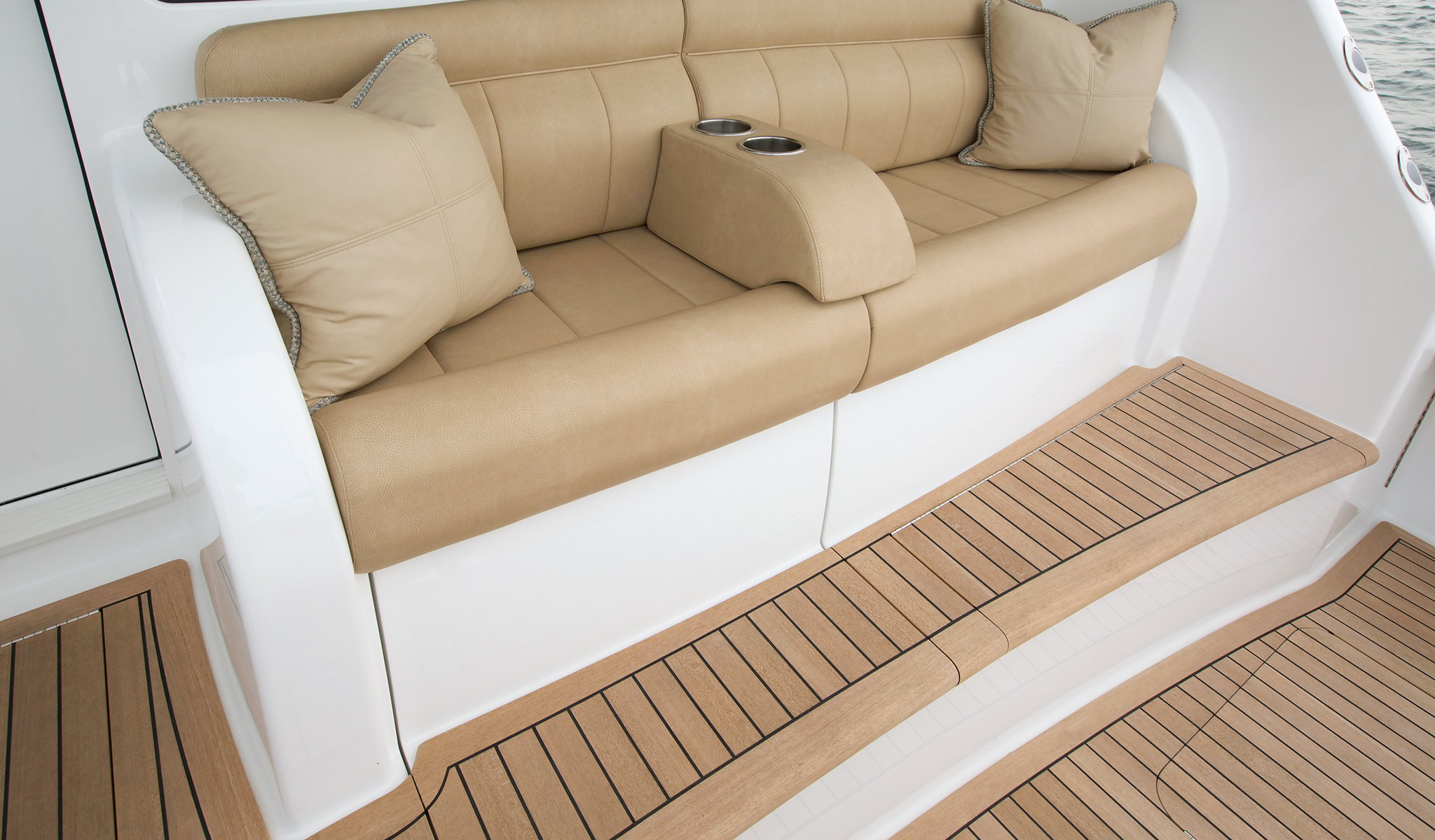The lush interior is rich in detail with our signature hand-finished teak or walnut joinery depending upon the owner’s selection. Taking advantage of the spacious beam, the salon abounds with stylish appointments throughout the salon with an L-shape lounge and cocktail table, as well as an inviting dinette, which anchor the area for relaxing and entertaining. To starboard the peninsula galley has a raised bar top and is accented with Cambria treatments, under counter refrigeration, a microwave/convection oven and ample stowage behind the maple-lined cabinetry. Overnight accommodations are plush with three staterooms and two heads providing all the comfort and privacy you need for fishing and cruising in style. A laundry center and central vacuum system add sophisticated convenience.