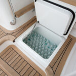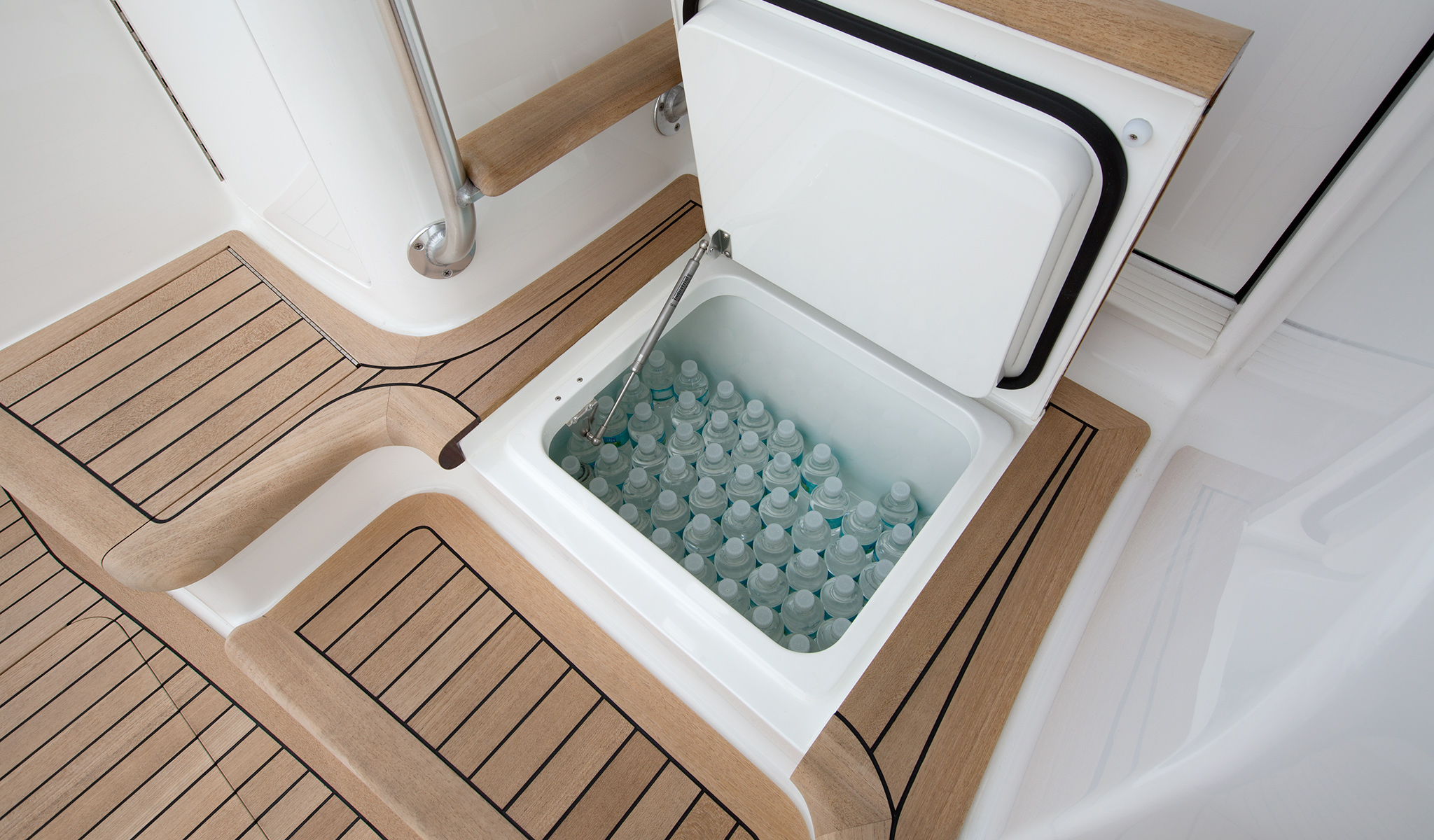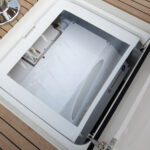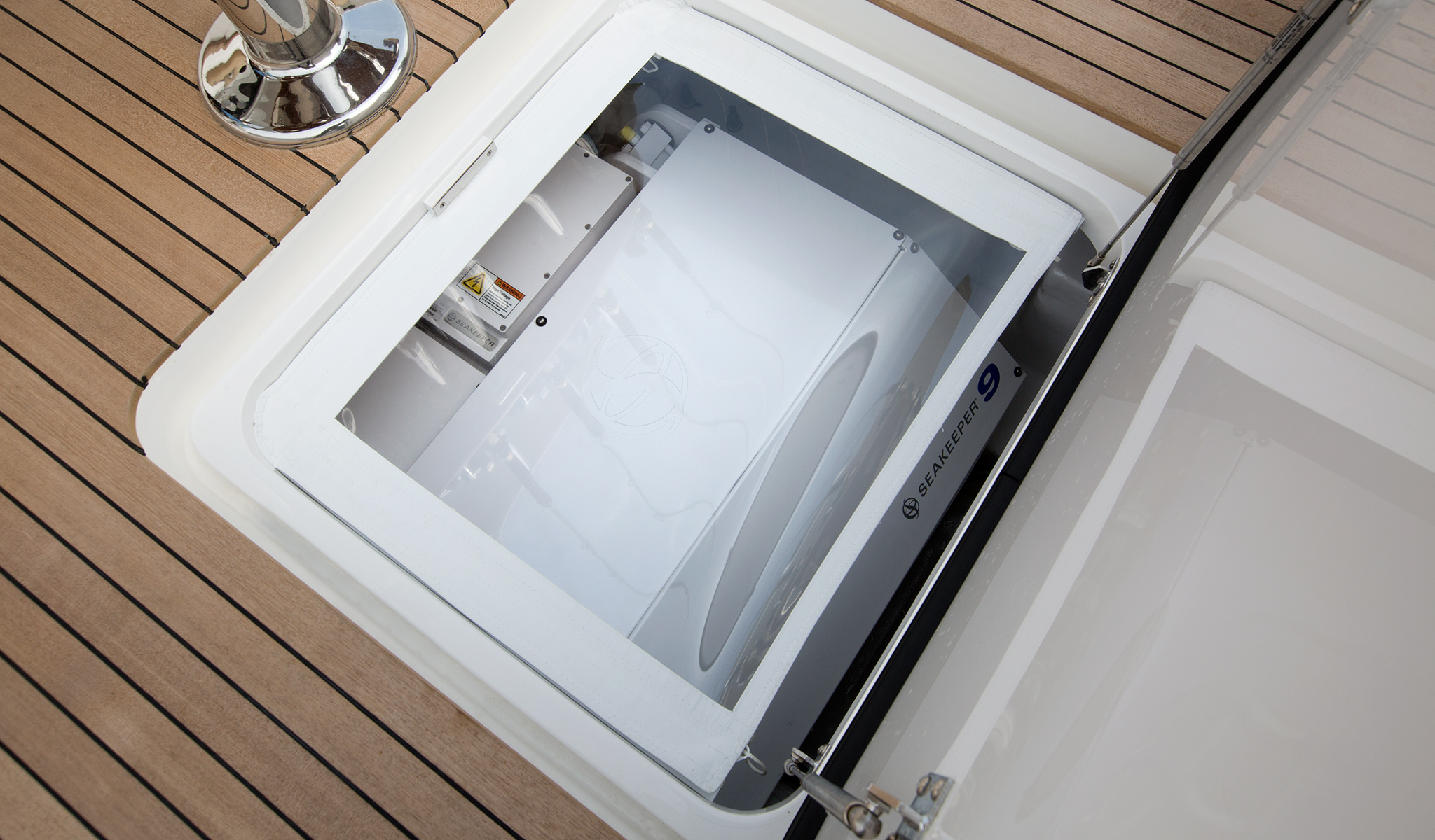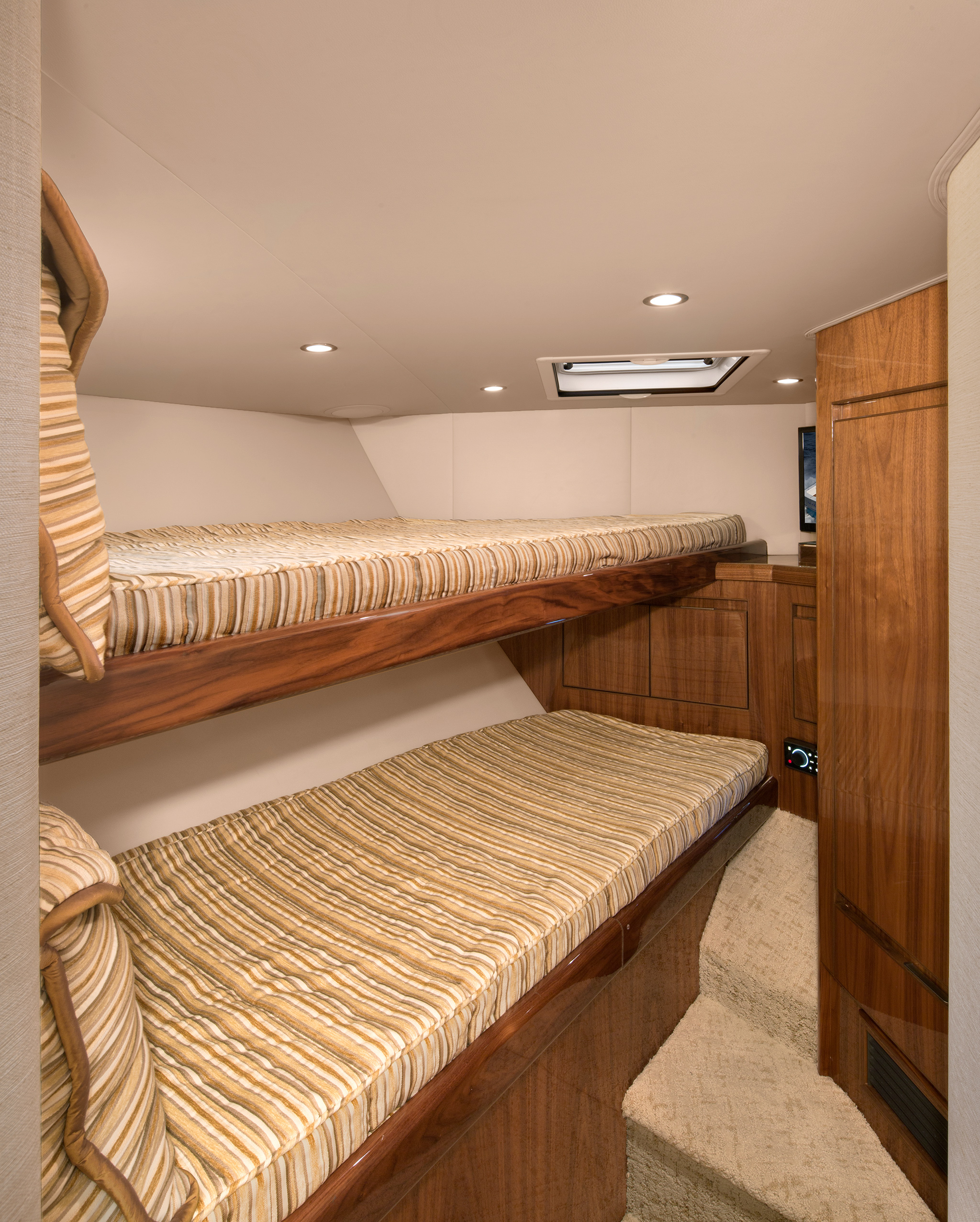 On the flying bridge, the center console helm and flanking lounges are tournament proven and will make the Viking 48 Convertible the envy of anything in its class with its custom navigation and communication systems provided by our subsidiary Atlantic Marine Electronics. Powered with MAN diesels the 48 Convertible will cruise at 30 knots with a top end in the mid 30 knot range depending upon engine selection, load, sea and other environmental factors. Engineroom access is through the observation mezzanine in the 124 square-foot cockpit, which features flush rod holders, a transom fish box, and recessed fish and stowage wells in the nonslip fiberglass sole. A transom door with lift gate, a drink box, a bait cooler and tackle stowage are standard. The lazarette is designed to accommodate a Seakeeper gyro stabilizer, which can be installed at the factory or a later date.