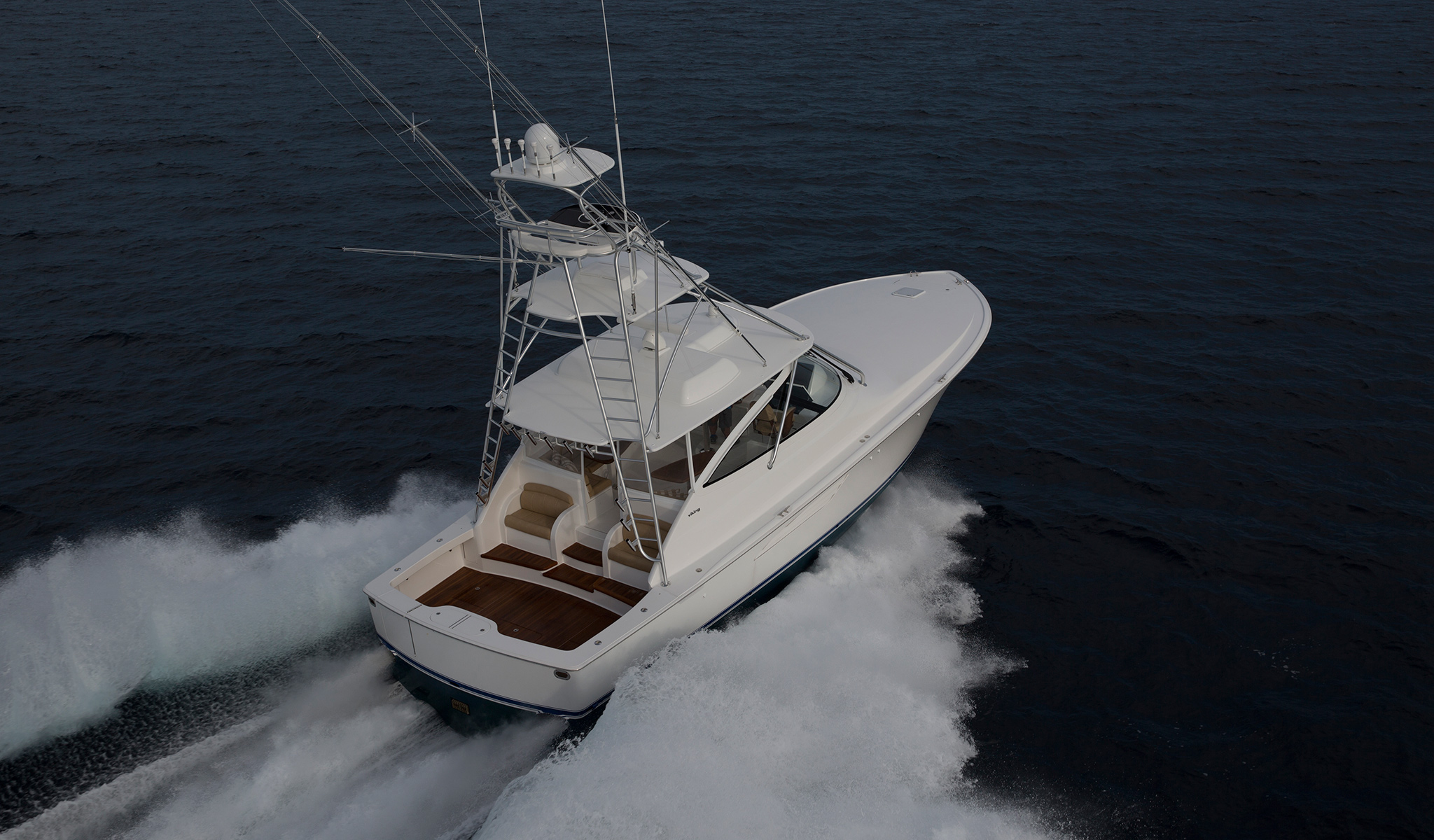 Completely unique and exciting profiles are offered with two other versions of the Viking 48 featuring a three-sided fiberglass, air conditioned deckhouse. Adding dashing definition and versatility this yacht can be further personalized with a Palm Beach Towers tuna tower for our Sport Tower version, or fitted with a radar arch or fiberglass mast for our savoir-faire Sport Coupe.