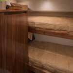 The lush interior abounds with hand-finished teak joinery and spacious appointments throughout the salon including a flat screen television with surround sound. An L-shape lounge and dinette anchor the area for relaxing, dining and entertaining. To port, the galley is accented with Cambria treatments, under counter refrigeration, a microwave/convection oven and plenty of stowage. Inviting accommodations in two staterooms include a queen-size bed forward with private access to the head. A starboard stateroom has upper and lower berths.