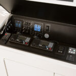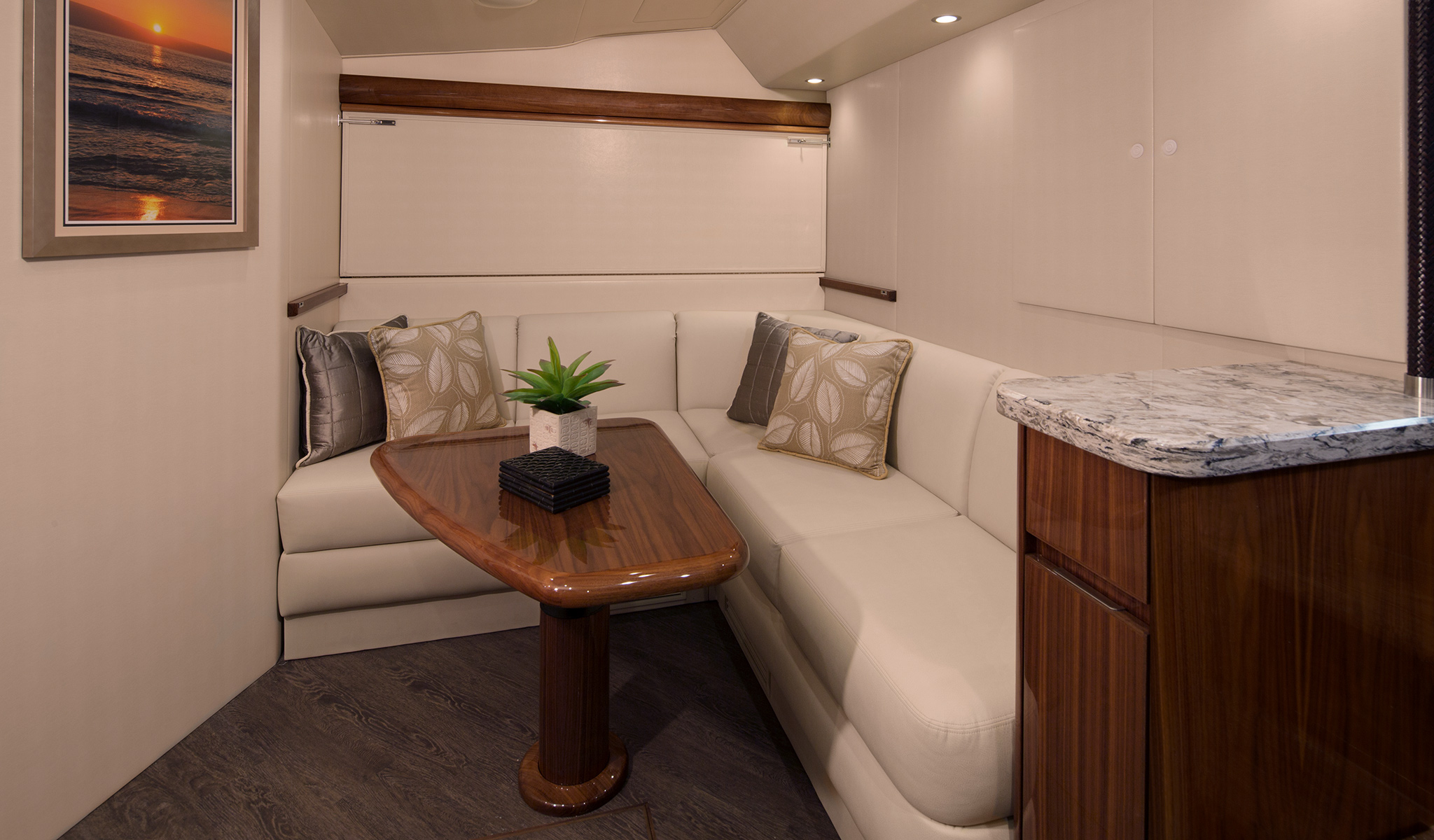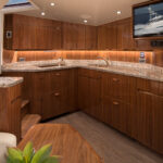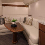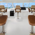 Spacious and airy, the command deck has three pedestal seats, L-shape port and starboard molded fiberglass consoles with stowage and available refrigeration. Each console is complemented with a pedestal mounted table and generous seating. The centerline helm delivers excellent sightlines, power-assisted hydraulic steering, single lever electronic controls and sophisticated communication, entertainment and navigation electronic systems from Atlantic Marine Electronics to deliver each boat turnkey ready.