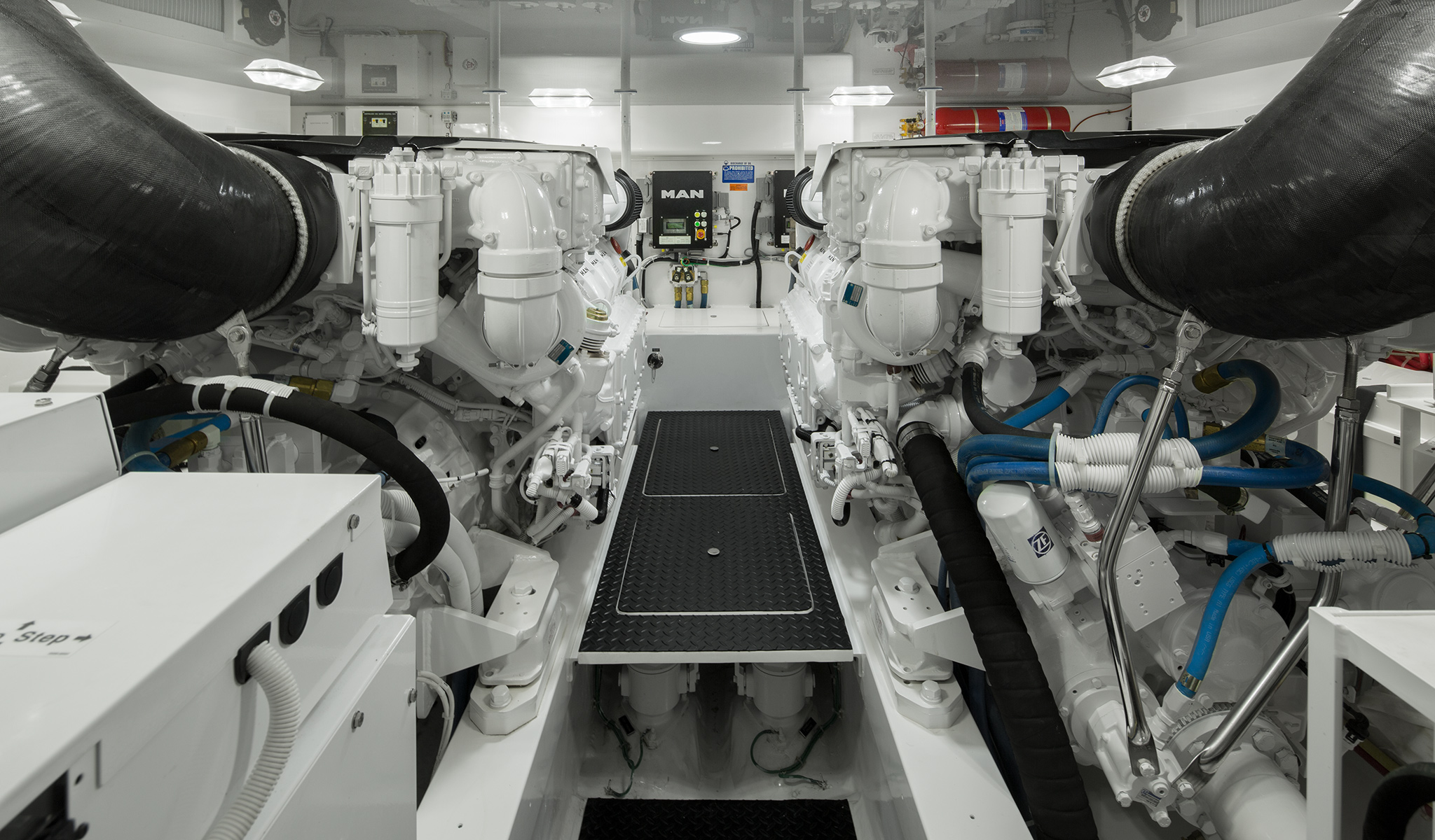 Powered with MAN diesels the 48 Convertible will cruise at 30 knots with a top end in the mid 30 knot range depending upon engine selection, load, sea and other environmental factors. The raked entry and forward chine are designed to pierce through head seas and divert spray downward. Convex hull sections add curvature and form to the running surface, while molded running strakes accentuate lateral tracking and maneuverability.