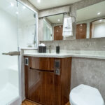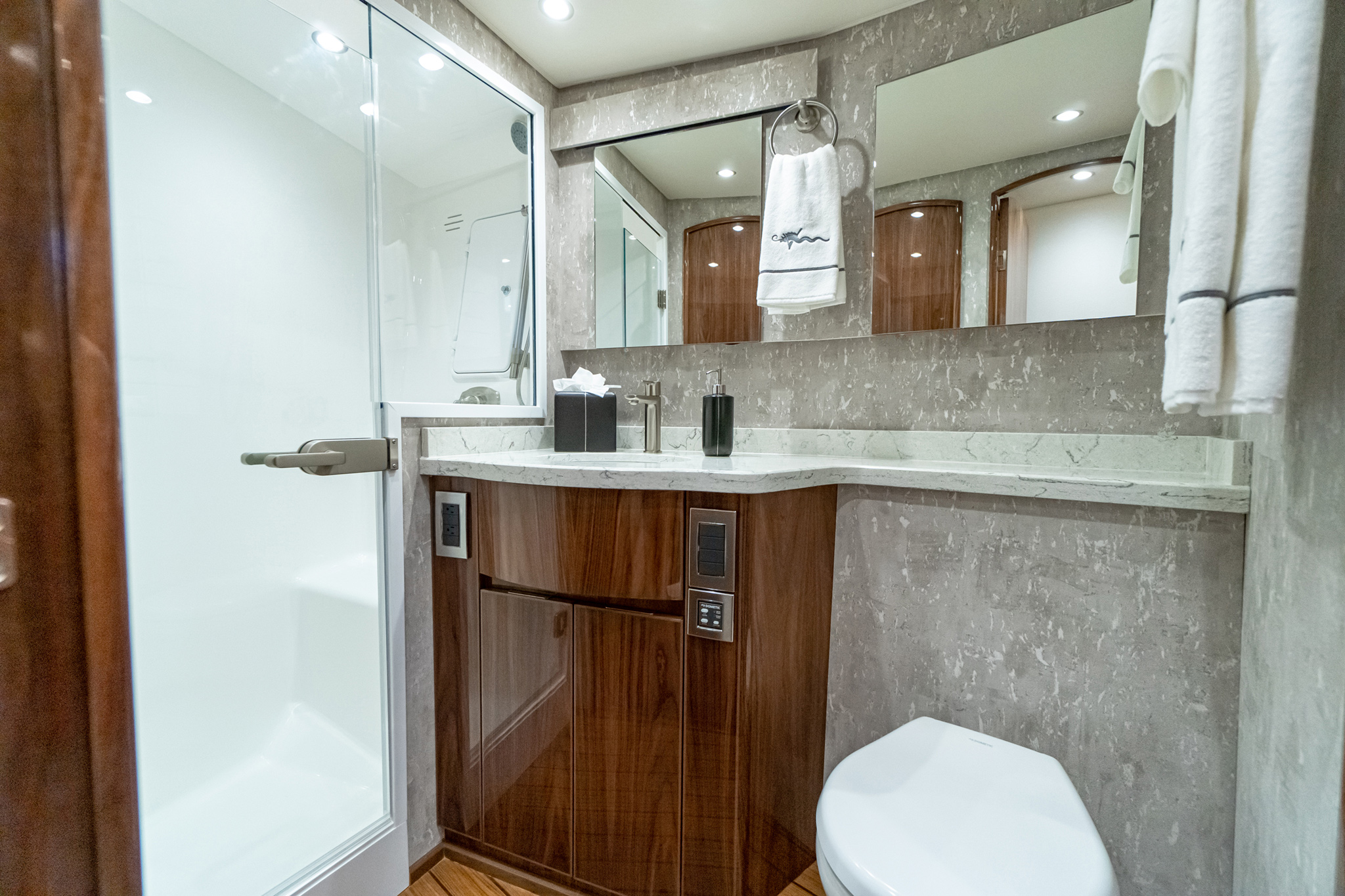 The heads feature custom Amtico flooring, a lower vanity, a medicine cabinet with mirrored doors, exhaust fans, air conditioning and electric heads with holding tank and overboard discharge capabilities. Both also boast very large walk-in one-piece fiberglass showers with an expansive glass enclosure and door. Below the detachable shower head, you’ll find a convenient storage cabinet as well as an integrated fiberglass seat.