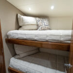 The three-stateroom two-head layout includes a master suite to port with a walk-around queen berth sided by night stands and a credenza to port. There’s a large maple-lined storage area beneath the mattress, accessed via a gas piston-assisted lift-up top, and two drawers are integrated into the foot of the bed. A 32-inch HD TV is mounted above a second credenza. A generously proportioned maple-lined hanging locker accommodates a sizeable wardrobe.