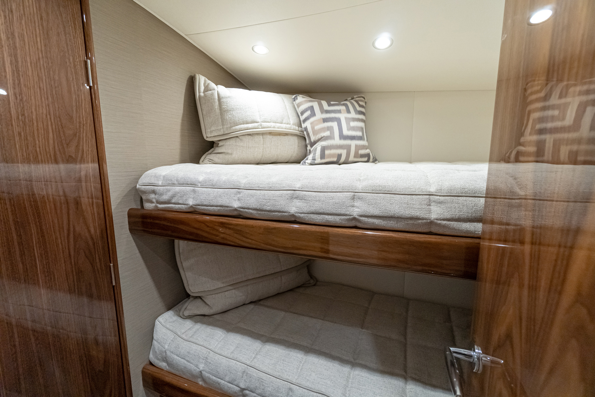 The forward stateroom comes standard with a queen berth, but also is available with a crossover berth arrangement. Both plans offer plenty of storage along with a 32″ HD TV. The starboard stateroom has upper and lower berths along with a hanging locker and storage under the lower berth. Each stateroom is fully carpeted, with dedicated temperature and stereo controls, speakers and overhead LED lighting.