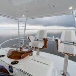 A Viking flybridge is a place of never-ending design modification to optimize operator ergonomics, fishability and the comfort and convenience for guests. A streamlined walk-around center console provides 360-degree sightlines. Touchscreen electronics displays and a row of Bocatech switches with power status LED rings are flush mounted in the helm dash. Their installation and positioning heighten viewability and ease of access.