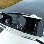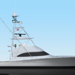 Custom fabricated 1-inch-thick aluminum saddles are used to reinforce the installation of the engines to the yacht’s stringer and hull structure. The saddles are permanently affixed to the stringers using a specialized structural adhesive, effectively becoming integral parts of the stringer foundation to distribute the engine loads across the entire hull and stringer structure. The 54 Convertible’s custom engineering includes a fuel tank configuration that allows the installation of a sonar tube in the engineroom for Furuno’s 360-degree real-time sonar that’s become popular on the tournament circuit. The engineroom is also home to a user-friendly 21.5 kW Onan E-QD (electric quiet diesel) Series generator and batteries in custom fiberglass storage boxes.