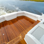 The helm and companion chair (with teak ladder backs) supply ample comfort for those long rides to the canyons, and guests can take it easy in the port or starboard lounges (with forward-facing backrests) or forward console seat. All guest seating doubles as storage for rods, tackle and other gear.