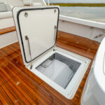 Multiple insulated fishboxes of various capacities increase flexibility. The raised transom box can be used as a live well, fishbox or general storage. A full-length in-deck fishbox spans the starboard side, while the port side holds two storage compartments with the forward serving as an optional live well. A mounting plate laminated into the sole will anchor the mightiest of fighting chairs, and you can also opt for a rocket launcher or table. All in-deck boxes are finished on both sides, and their lids are equipped with latches and thick rubber gasketing to prevent water intrusion. Deep gutters with overboard drains rim the hatch perimeters. A single centerline lazarette hatch (available with power actuation) opens nearly 90 degrees for full viewability and access to the available Seakeeper as well as the steering, trim tabs and drain pumps.