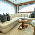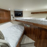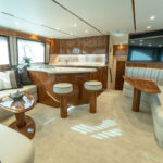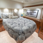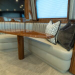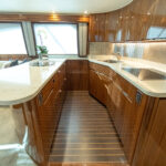 A 50″ HD TV is nested on the forward starboard bulkhead above the dinette, which is appointed with a high-gloss mappa burl table and wraparound seating for four. The galley’s peninsula countertop features engineered stone with an overhang and two convenient bar stools. The galley is feature-packed with a pair of under-counter Sub-Zero refrigerator/freezer units and storage under the peninsula counter. The opposite counter is home to a stainless steel sink with garbage disposal and an electric cooktop. Above, you’ll find an array of storage cabinets, one of which holds the microwave/convection oven. Custom Amtico flooring rounds out the galley’s amenities.