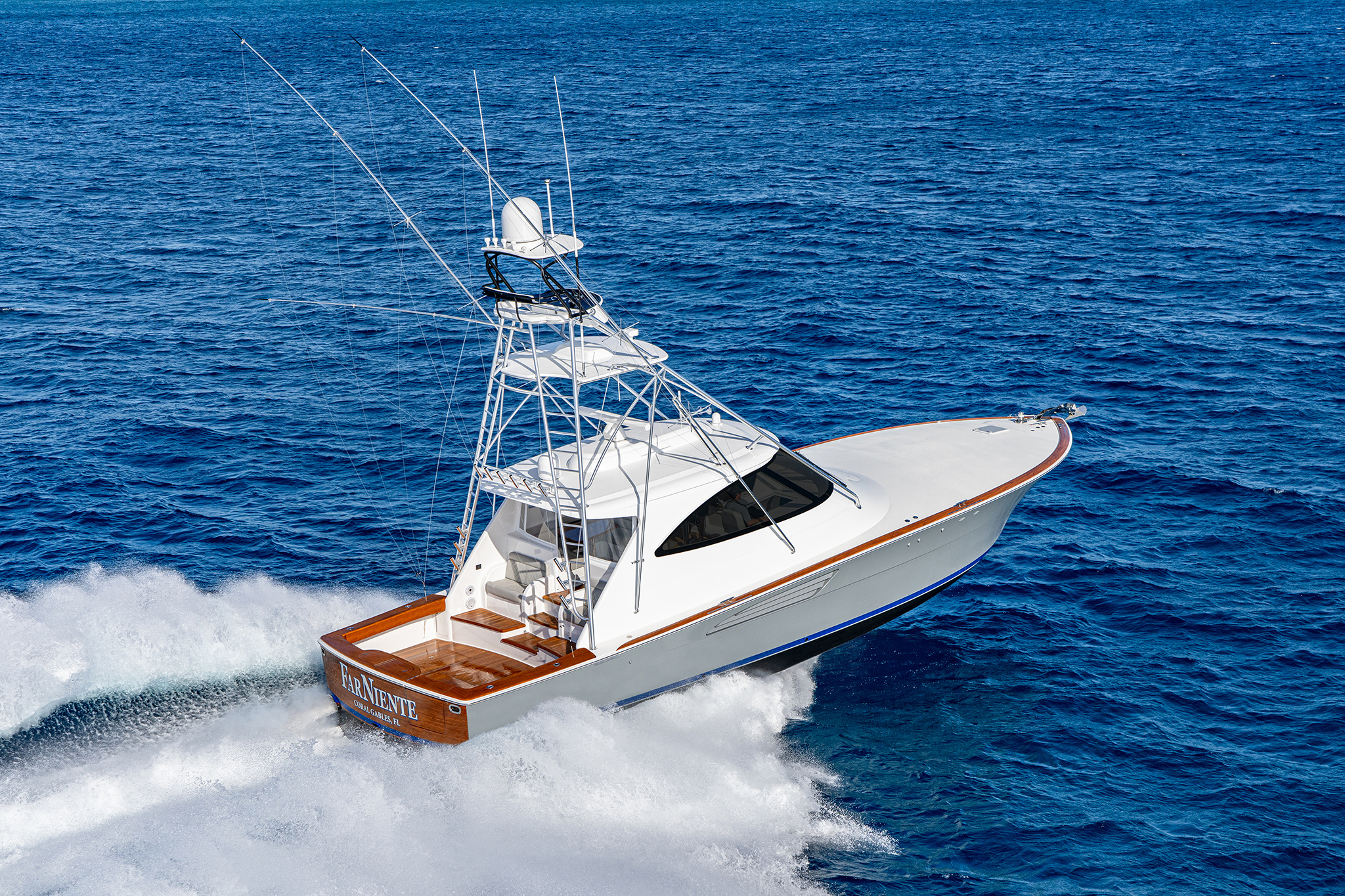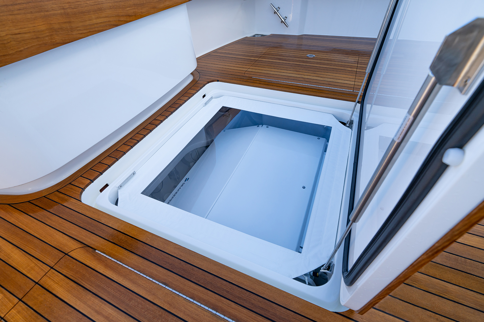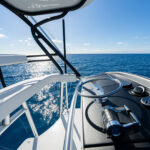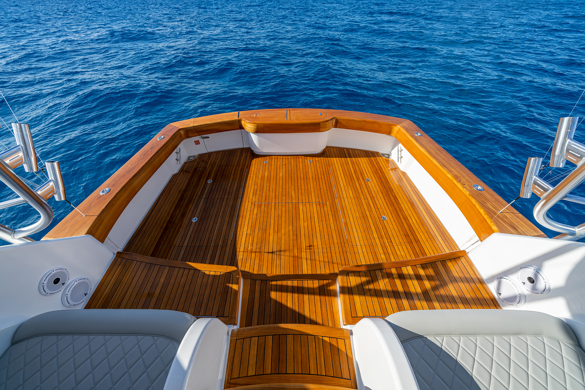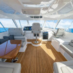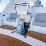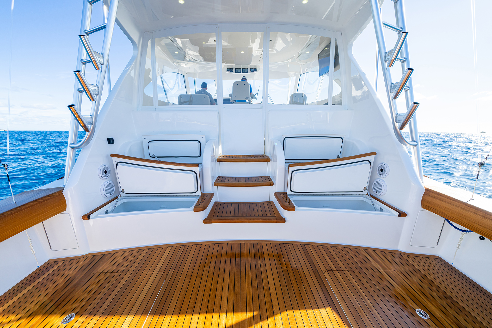 The Open, Sport Coupe and Sport Tower share cockpit and command deck layouts, providing an excellent use of space for fishing, diving, cruising and entertaining. The 154-square-foot cockpit boasts twin mezzanine seating with cooler storage below (easily converted into optional freezer space), along with drink coolers, in-deck fish and storage boxes, a transom live well and a transom door with lift gate. A single centerline lazarette hatch (available with power actuation) opens nearly 90 degrees for full viewability and access to the available Seakeeper 9, 16 or 18 as well as the steering, trim tabs and drain pumps.