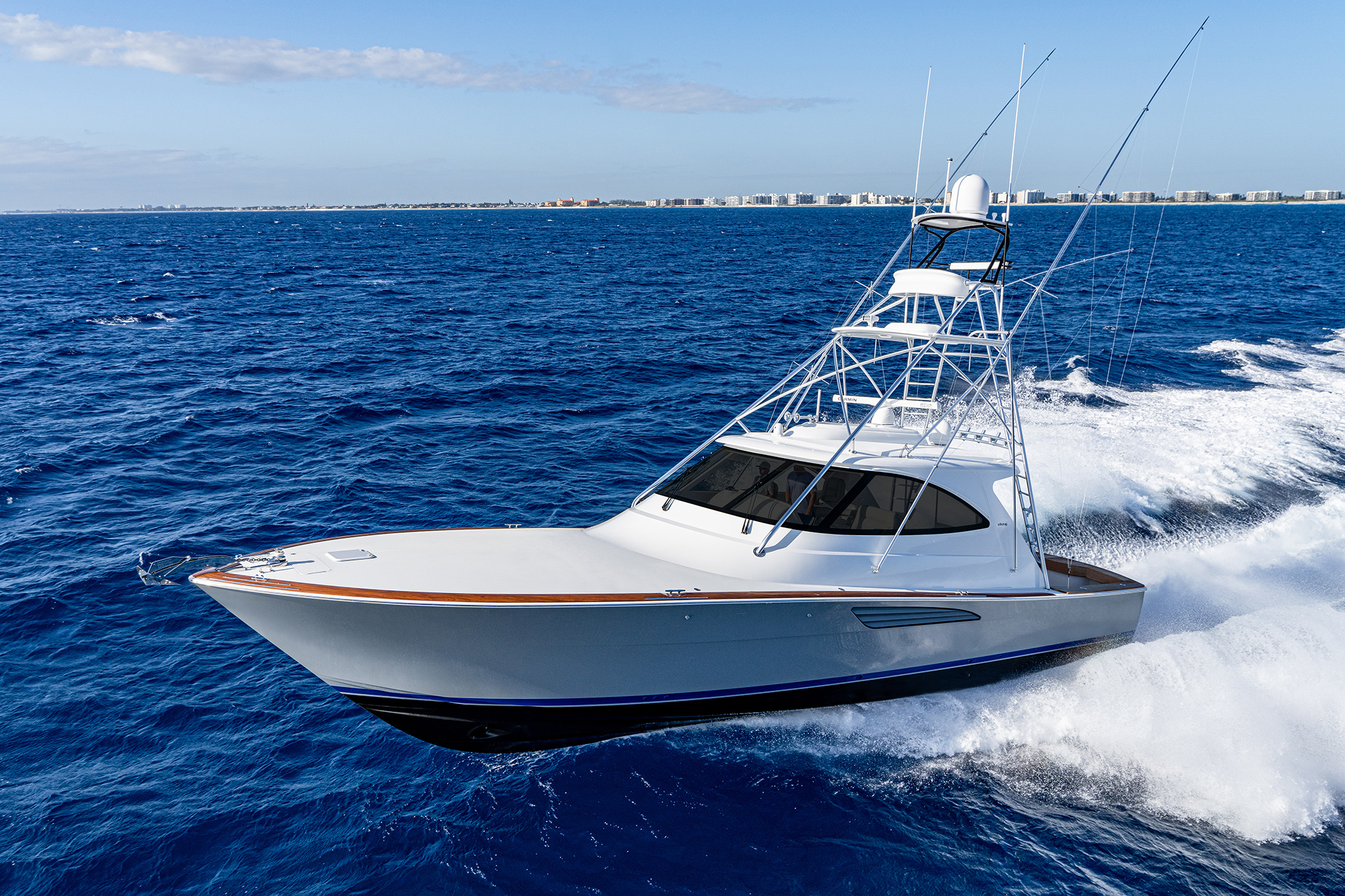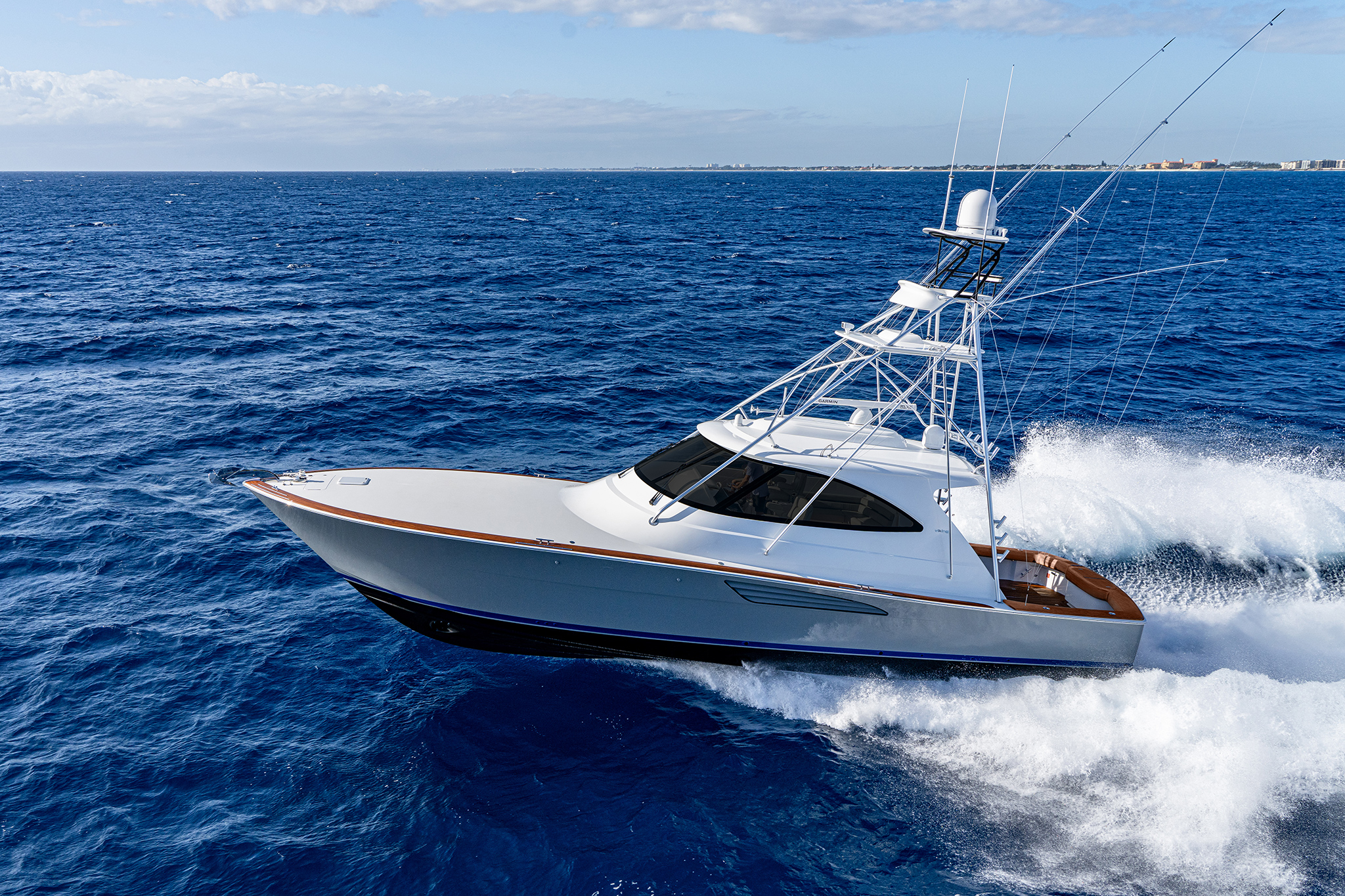 With its aggressive entry, raked stem, one-piece wraparound windshield and Palm Beach Towers (PBT) hardtop and tuna tower, the 54 O presents a striking profile while excelling as a stylish fish-and-cruise Viking thoroughbred. The 54 ST features a three-sided fiberglass deckhouse (with an optional solid aft bulkhead) and a PBT tuna tower. This version is also available sans tower in our sophisticated SC rendition. Similarly, the 54 O can be delivered without a tuna tower as a sleek express yacht. All three models run on the same advanced hull form of the 54 C, which has exceeded all performance expectations.