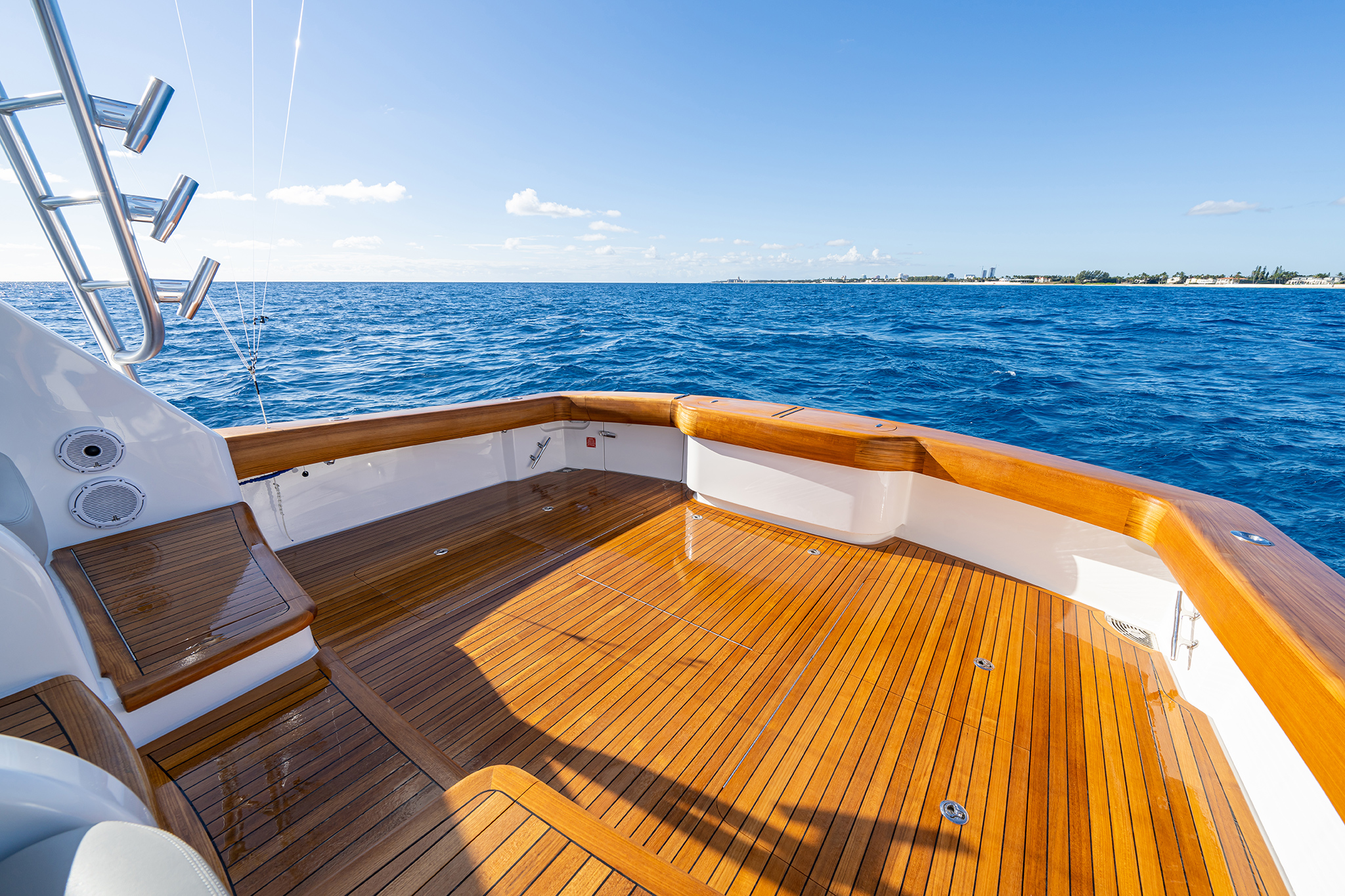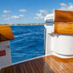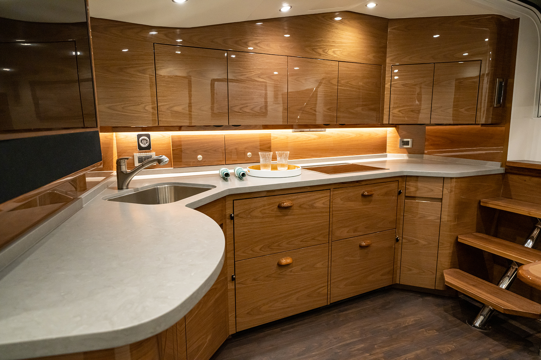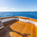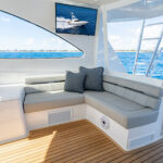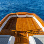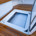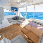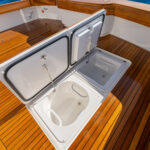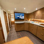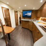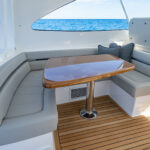 Aft of the helm, there is a convergence of practical and convenience features, including refrigeration and tackle and gear storage compartments. Plump cushions topping the port-side U-shape lounge, which surrounds a walnut table, will cradle your guests in comfort while providing ample height to take in the surroundings. To port, you’ll also find an L-shaped lounge with storage underneath.