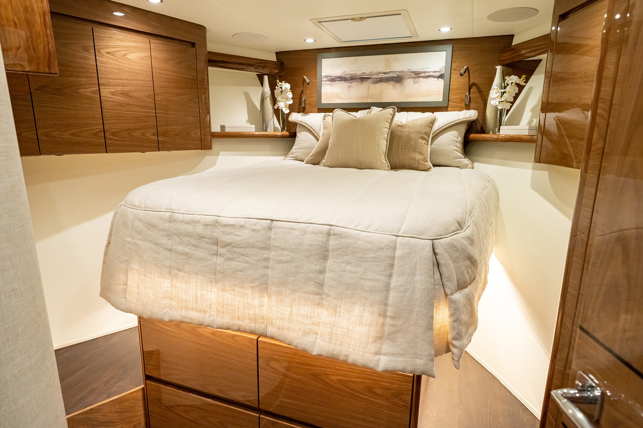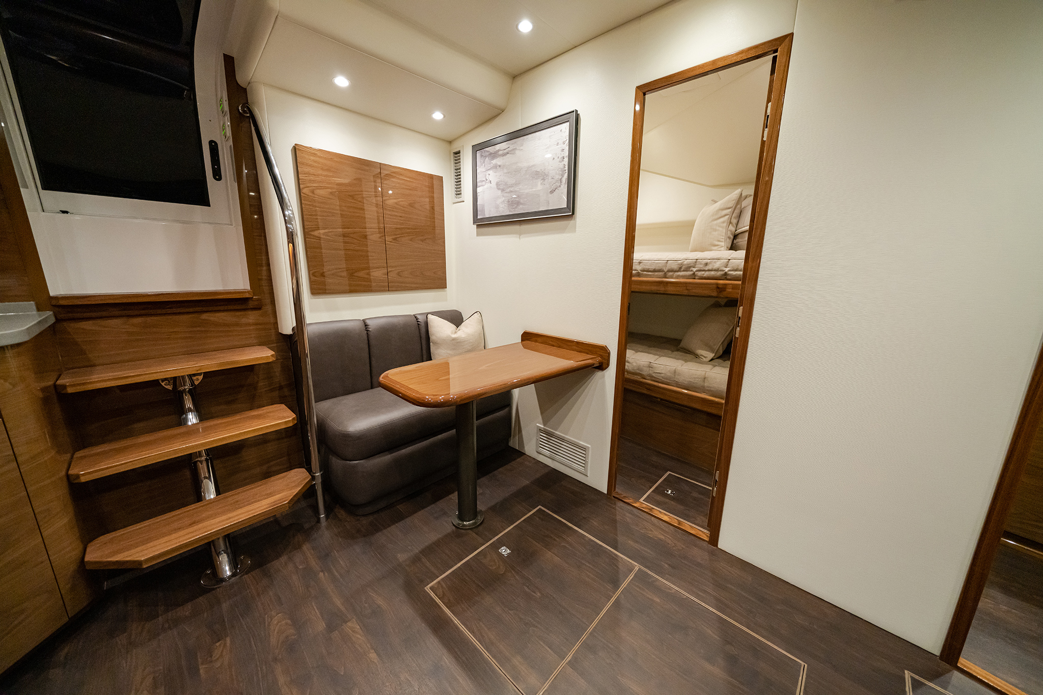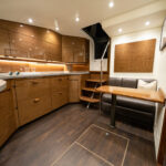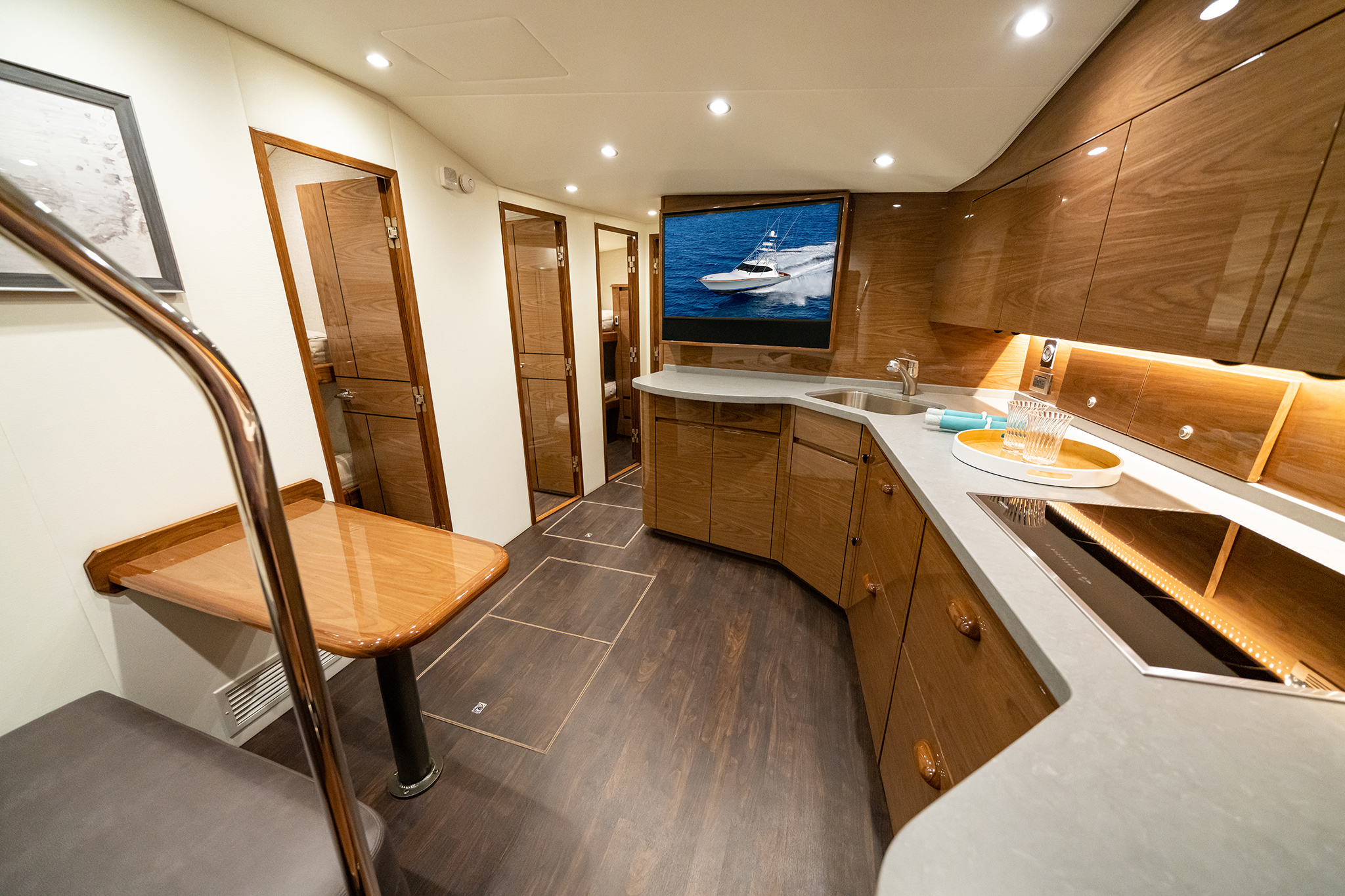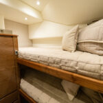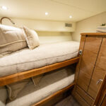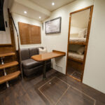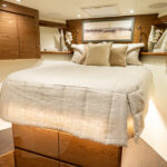 Below, the 17 ft. 8 in. beam offers volumes of interior space including a choice of two- or three-stateroom layouts. With either, the forward master stateroom is large and fitted with a queen-size bed, plenty of storage behind the horizontal grain walnut cabinetry and served with a private head. Additional staterooms are found on the port side, each with upper and lower berths. The head has private access in the two-stateroom layout, while guests share the head in the three-stateroom plan. Midship on the starboard side is a well-appointed galley with a full appliance package, walnut cabinetry, an engineered stone countertop and under-counter refrigeration/freezer units (with varnished horizontal grain walnut faces). Opposite the galley in the two-stateroom model is an L-shaped lounge and table. The three-stateroom version utilizes booth seating. Other notable amenities include a 43” HD TV, Amtico flooring in the salon/galley/dinette and premium carpeting in the staterooms.