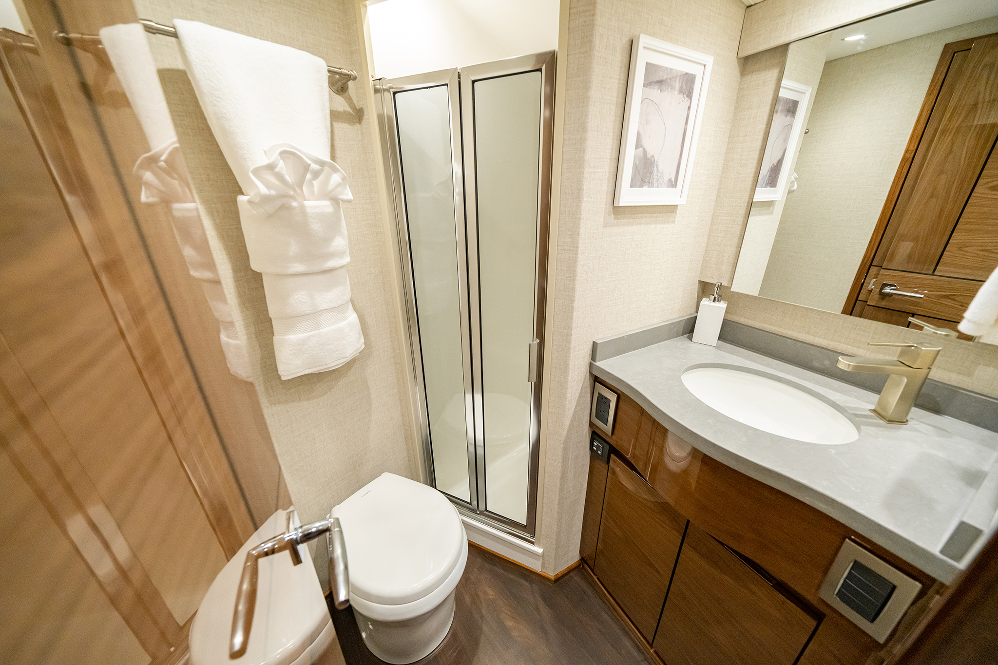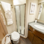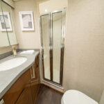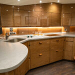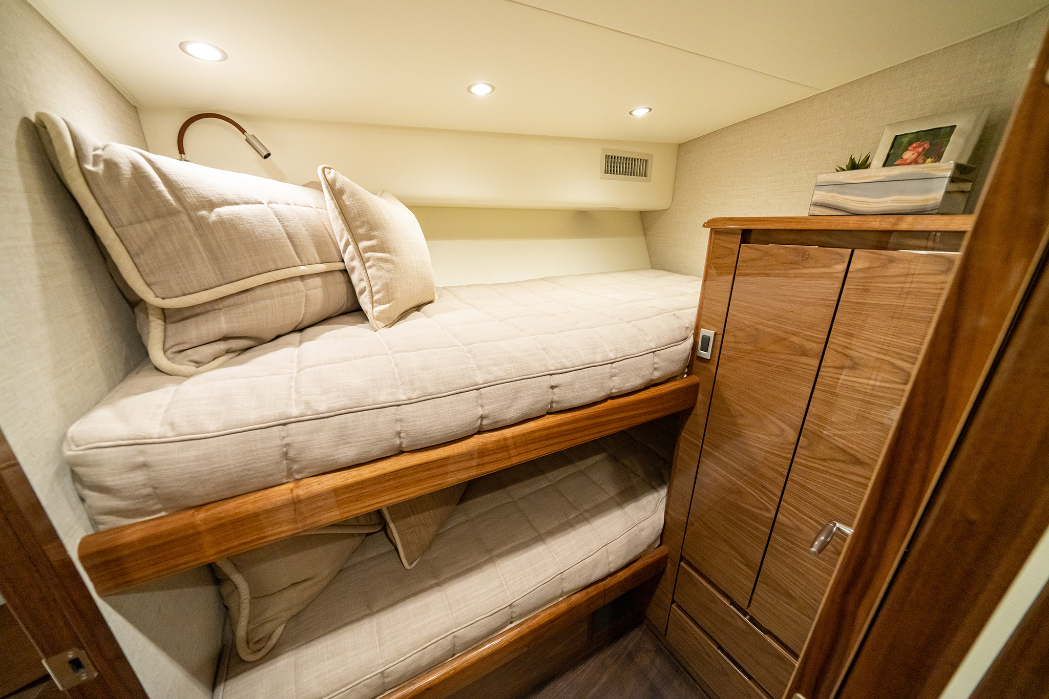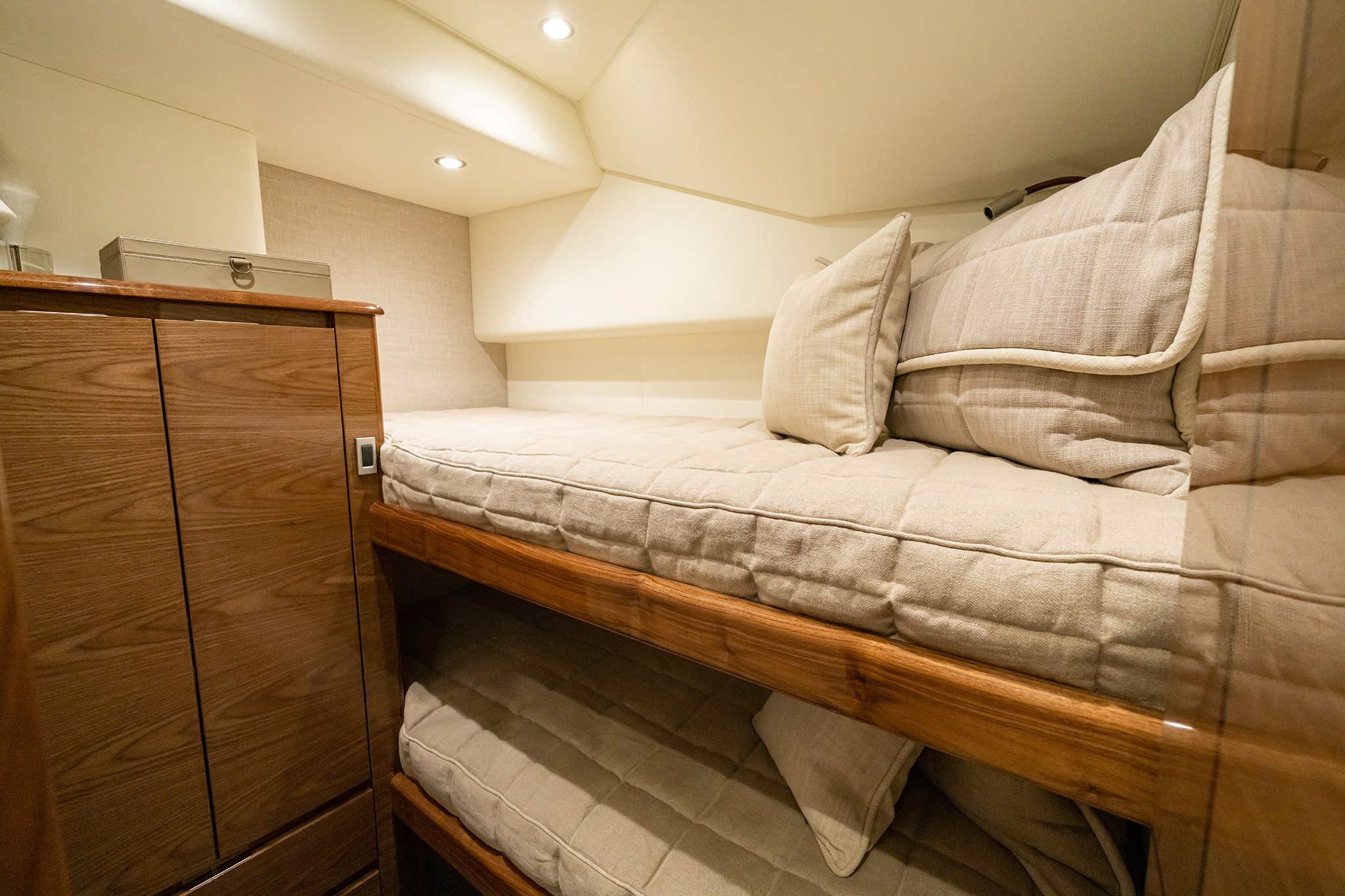 Below, the 17 ft. 8 in. beam offers volumes of interior space including a choice of two- or three-stateroom layouts. With either, the forward master stateroom is large and fitted with a queen-size bed, plenty of storage behind the horizontal grain walnut cabinetry and served with a private head. Additional staterooms are found on the port side, each with upper and lower berths. The head has private access in the two-stateroom layout, while guests share the head in the three-stateroom plan. Midship on the starboard side is a well-appointed galley with a full appliance package, walnut cabinetry, an engineered stone countertop and under-counter refrigeration/freezer units (with varnished horizontal grain walnut faces). Opposite the galley in the two-stateroom model is an L-shaped lounge and table. The three-stateroom version utilizes booth seating. Other notable amenities include a 43” HD TV, Amtico flooring in the salon/galley/dinette and premium carpeting in the staterooms.