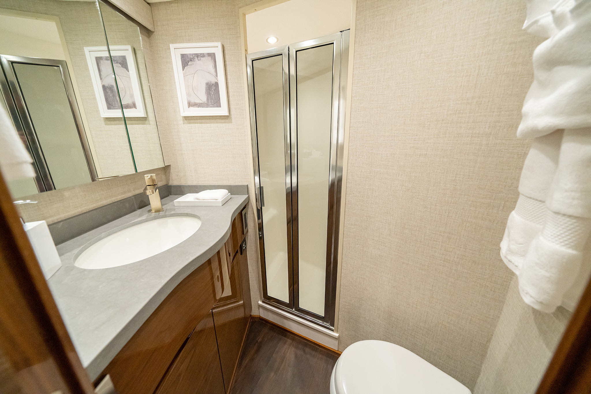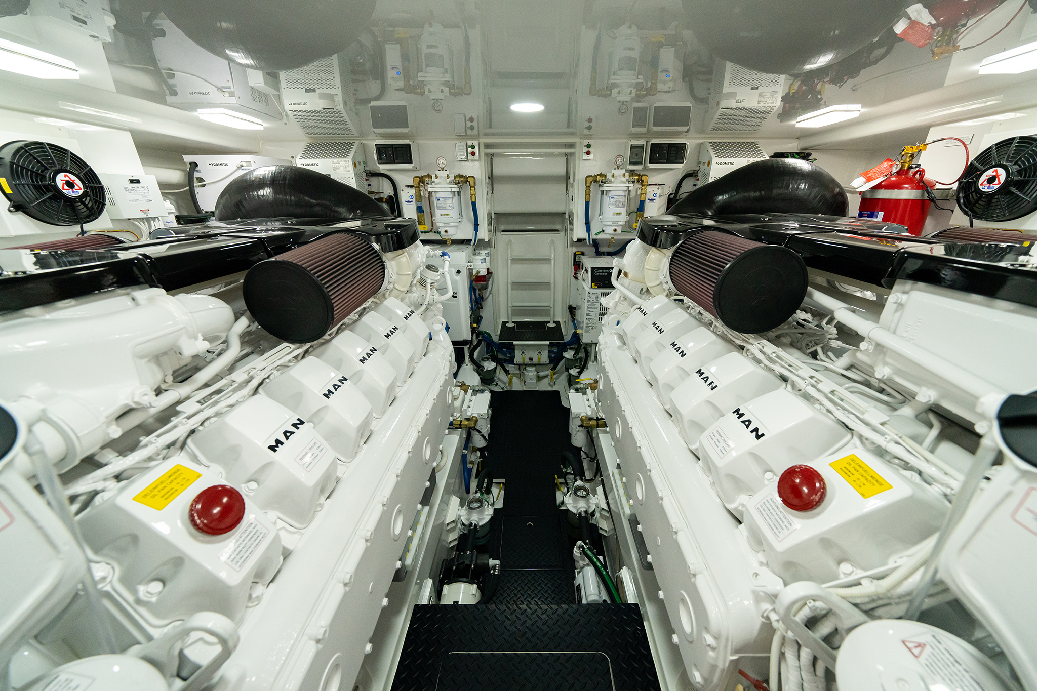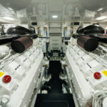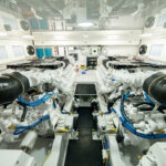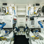 The engineroom, easily reached through lift-up steps built into the mezzanine, houses the twin powerplants. A pair of MAN V12 1400CRM (1400 MHP) engines serve as the standard propulsion package. Hull No. 1 – a Sport Tower model – will be powered with the optional MAN V12 1550CRM (1550 MHP) engines.