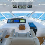 With its open aft bulkhead, the command deck gives you instant access to the cockpit. The centerline helm, with its pedestal seat on a raised platform, provides excellent visibility and is complemented by port (double) and starboard (single) companion seating. Three multi-function displays (up to 22-inches each) are flush mounted in a recessed black acrylic panel, contributing to the clean streamlined helm design. Bocatech switches and other operational controls and instruments are located in a large radio box to port of the raised helm pod. The MAN engine displays, autopilot and VHF radios are nested in a recessed area molded into the hardtop underside.
