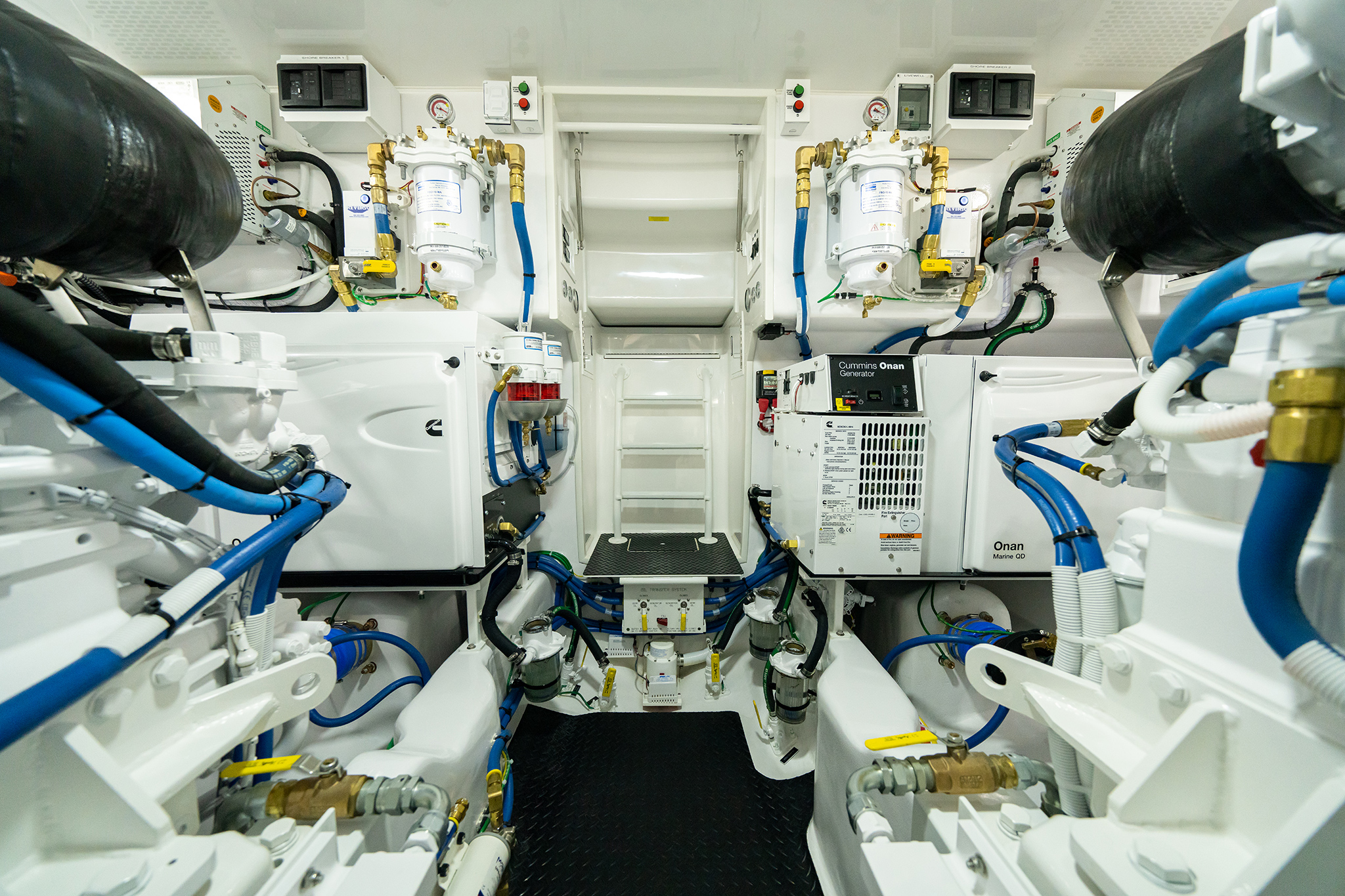 With its Optimus Electronic Power Steering matched to stainless-steel, high-speed rudders and single-lever electronic controls, the 54 delivers outstanding performance, comfort and range. As you would expect, the engineroom is equipped in the Viking tradition with outstanding engineering that is exclusive to this design and maximizes access and serviceability. Mechanical and electrical equipment includes a Delta-T ventilation system with supply and discharge fans for proper fresh air supply and water suppression; an oil changing system for the engines, transmission and generator; and a fire suppression system. The 54 also comes standard with an Onan 21.5 kW E-QD (electronic quiet diesel) Series generator.